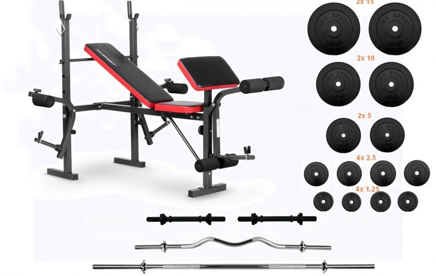 - 75 кг дисків: 2х 15 кг, 2х 10 кг, 2х 5 кг, 4х 2.5 кг, 4х 1.25 кг