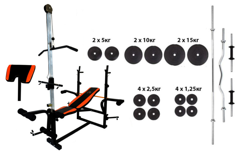 Лава 0070 + тяга з приставкою Скотта ця спортивна лава, оснащена важелями "батерфляй" для розвитку м'язів грудей та спини та блоком для тренування ніг, є повноцінним багатофункціональним силовим тренажером для дому складної конструкції.