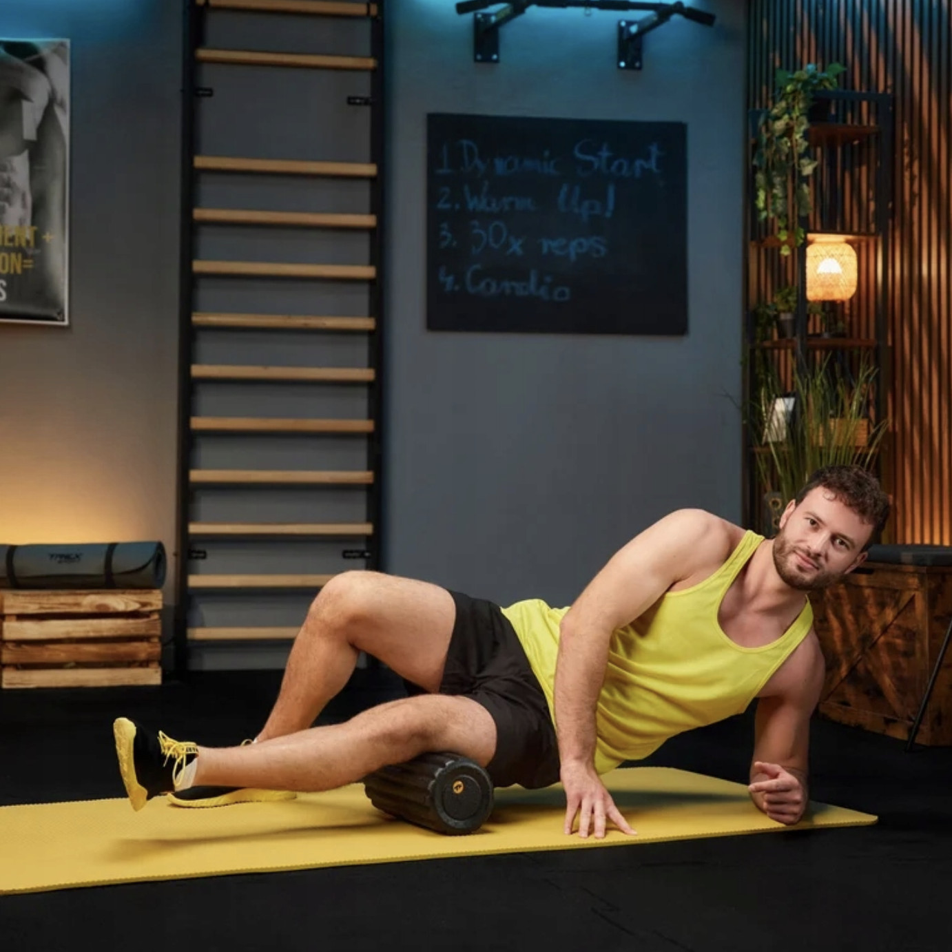 Щоб ефективно виконати самомасаж, ляжте на килимок, розмістіть ролик під вибраною частиною тіла. Використовуючи вагу тіла, повільно пересувайтесь вперед-назад, дозволяючи ролику ковзати уздовж м'язів. Масажуйте кожну ділянку протягом 30 секунд - 2 хвилин, зосереджуючись на напружених зонах. Завжди опрацьовуйте обидві сторони тіла для симетрії та балансу.