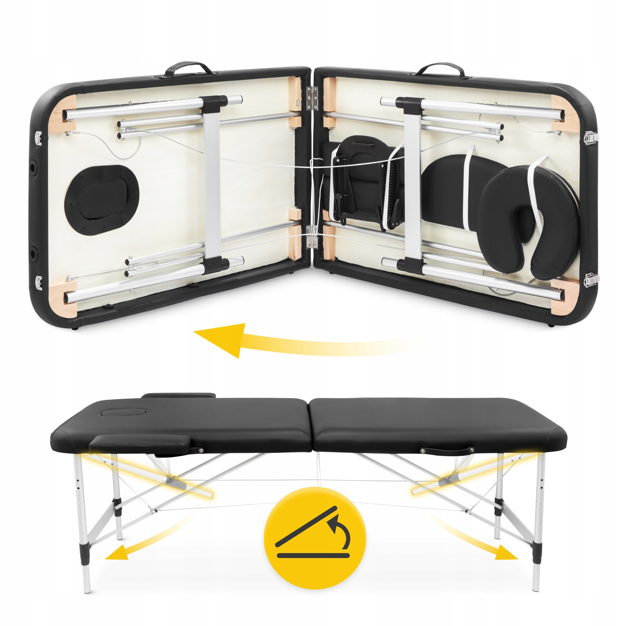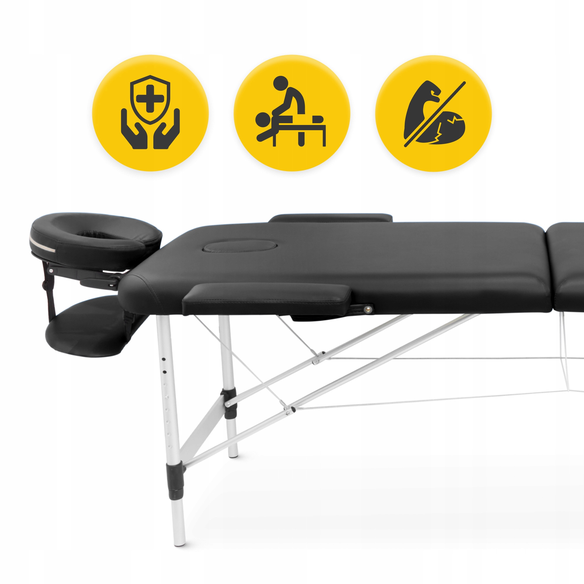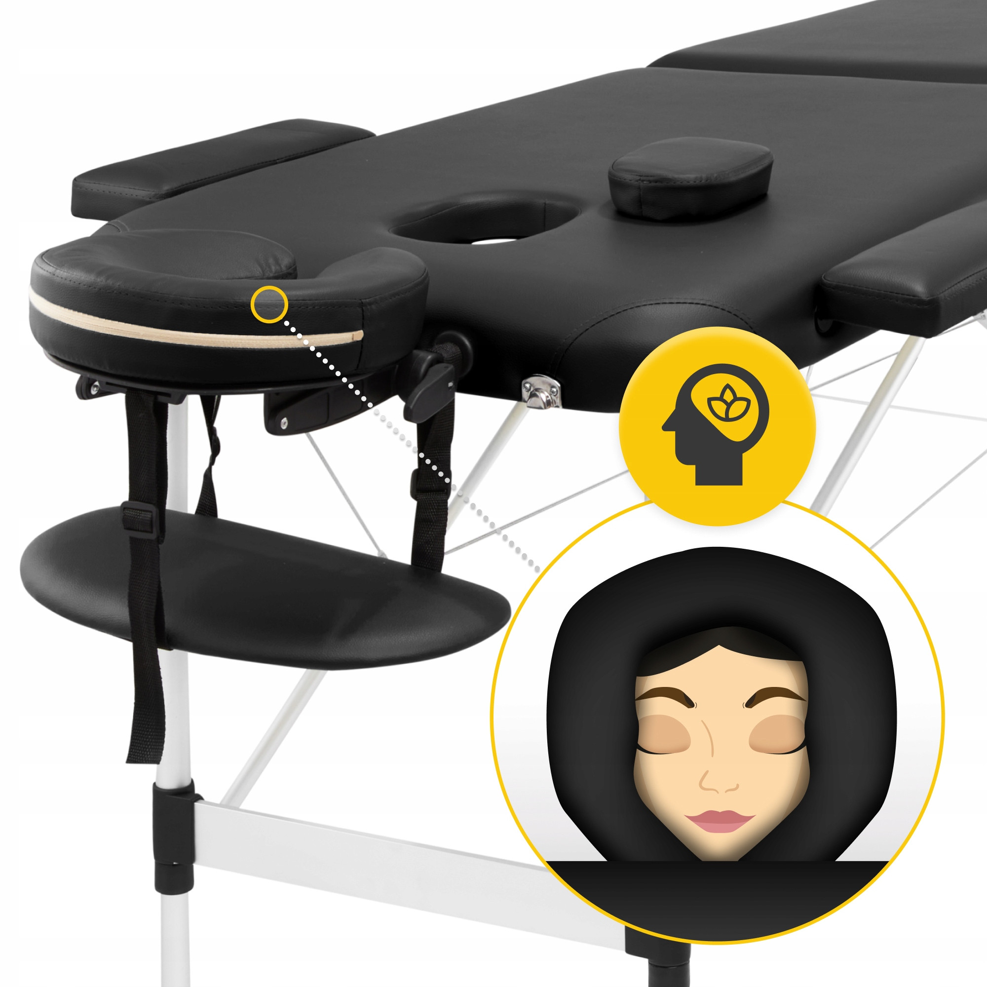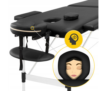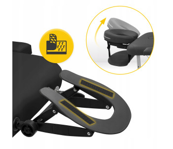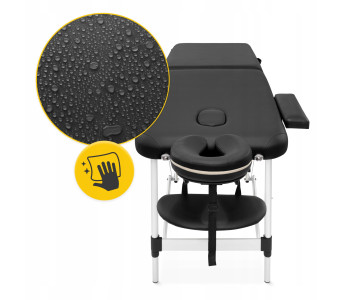 Масажний стіл від 4FIZJO сконструйований так, що всі елементи фіксуються нерухомо при складанні та поміщаються всередину транспортної сумки, що йде в комплекті. Каркас столу виконаний з алюмінію, завдяки чому він міцний та стійкий. Для додаткової безпеки конструкція столу підсилена стальними тросами, що утримують його від вібрації в розкладеному стані. Сегменти масажного столу покриті приємною на дотик екошкірою та наповнені м'якою піною, що адаптується до вигинів тіла. Борти закруглені для більшого комфорту використання. Стіл оснащений регульованими підлокітниками та полицею на якій також можна розмістити руки або використовувати її, як підставку для телефону. Профільований підголівник адаптується до форми обличчя та голови, тому не здавлює ніжні лицьові нерви. Виріб має безліч регулювань, що дозволить адаптувати його до різних видів діяльності.