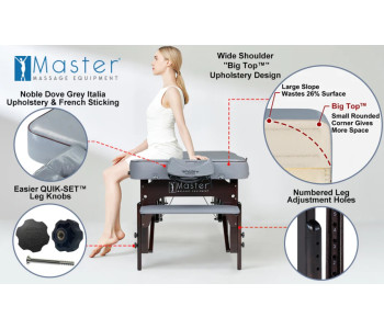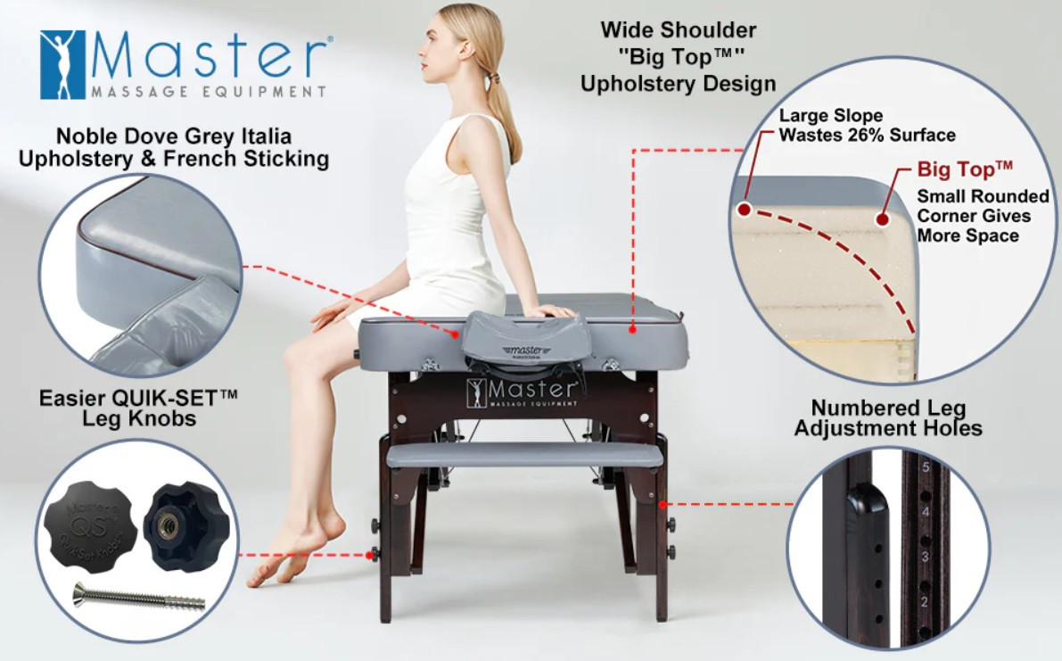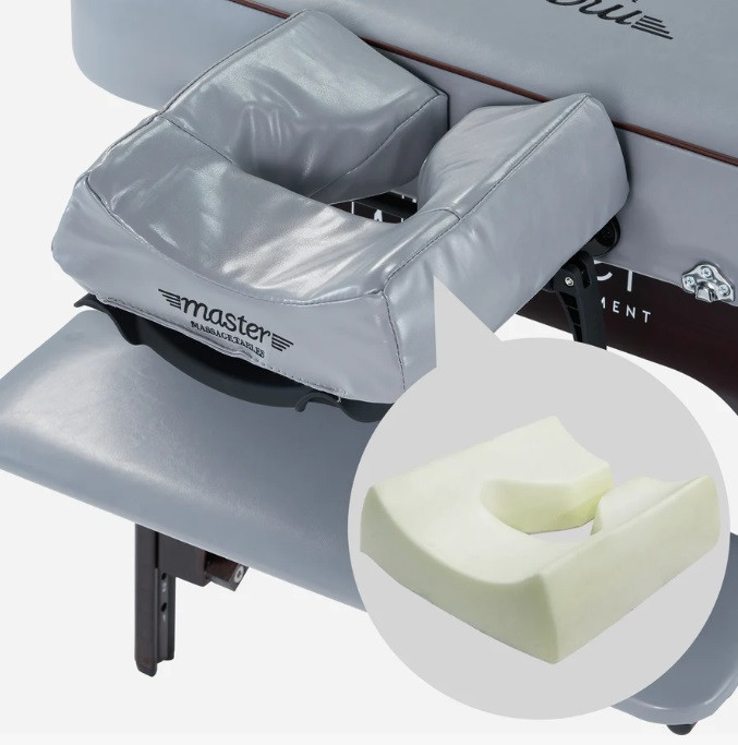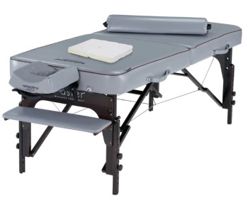 Масажний стіл Montour LX має привабливий дизайн з красивою поліуретановою оббивкою Dove Gray, стійкою до олії та води, не містить фреонів, та має джинсову підкладку для посилення своєї міцності.