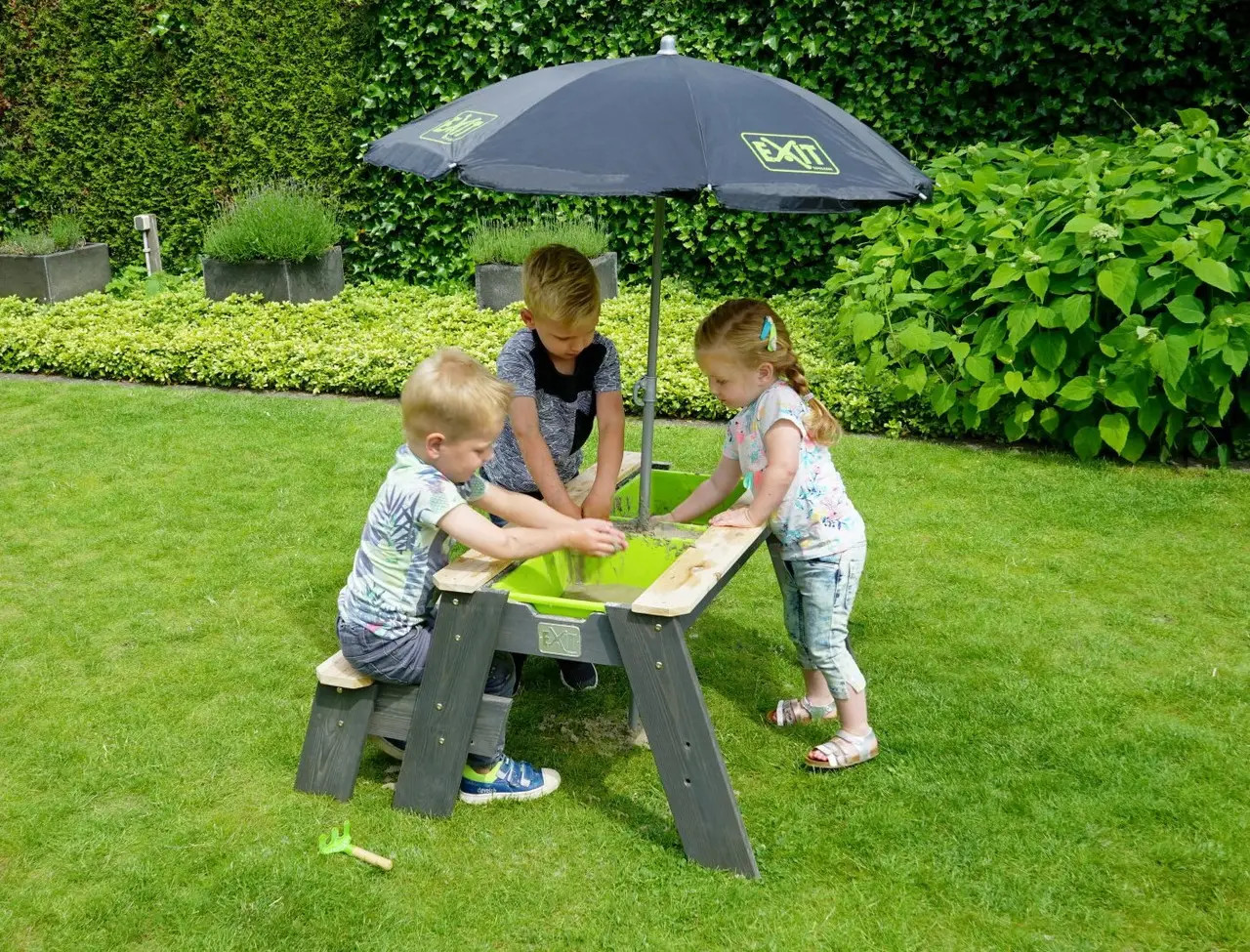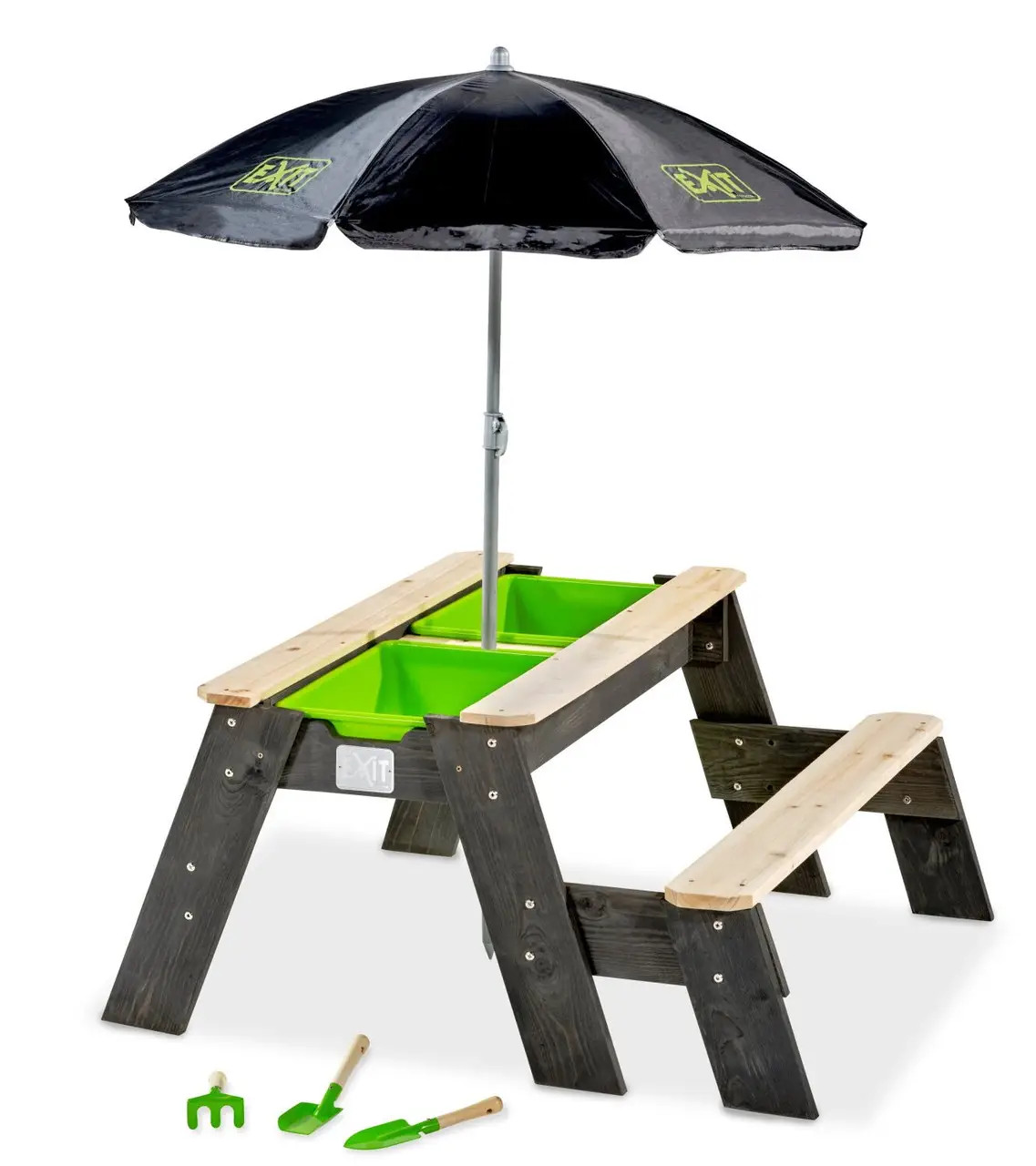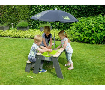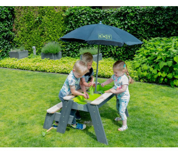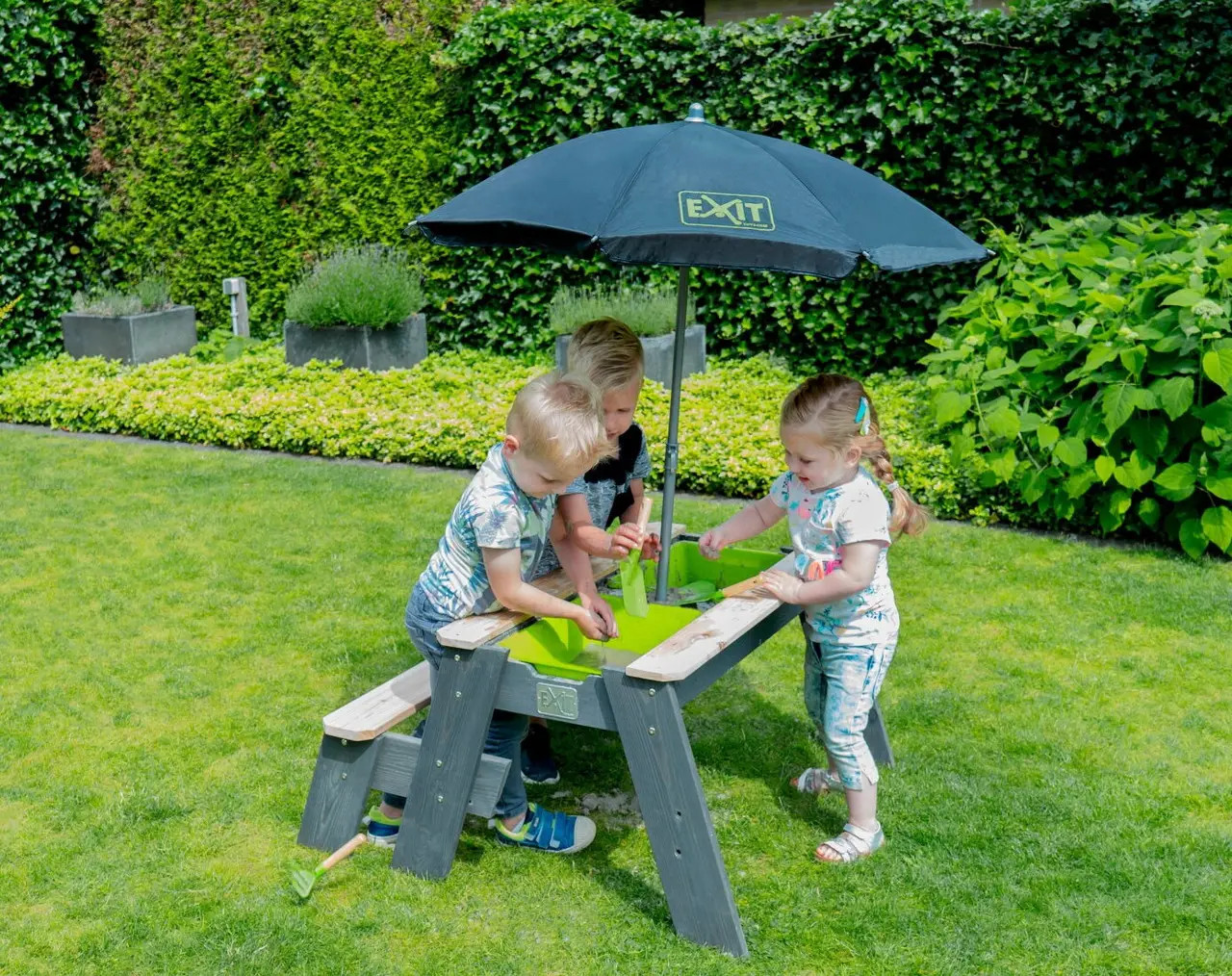 Стіл із лавкою для ігор з водою та піском EXIT Aksent із сонцезахисною парасолькою – універсальний стіл для пікніка, піску та води