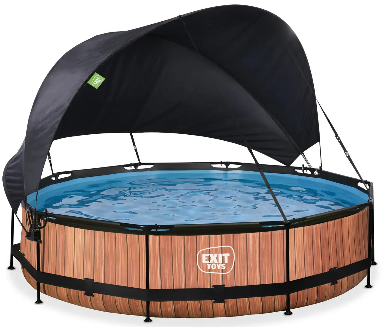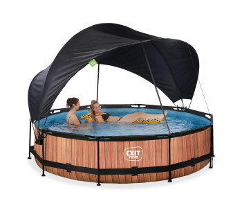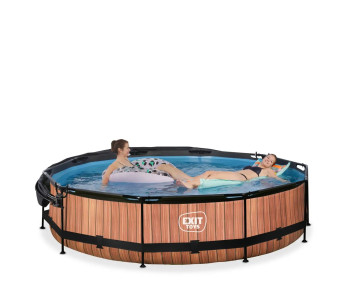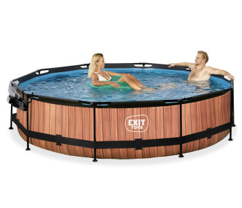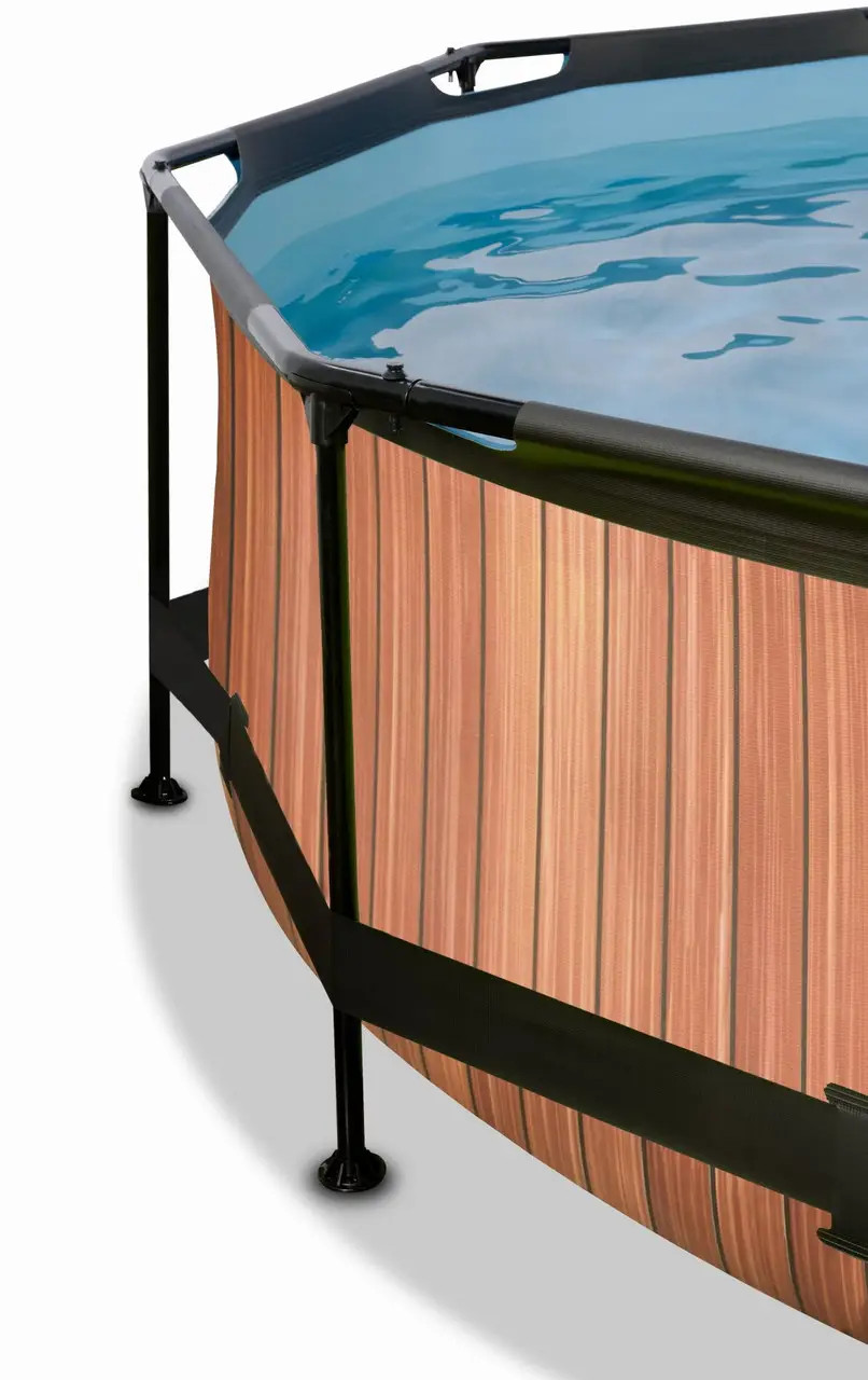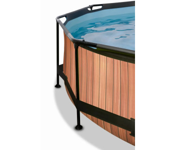 Басейн каркасний з тентом EXIT "Дерево" 360 х 76 см - компактний каркасний басейн круглої форми, який виглядає добротно, лаконічно і елегантно. Із зовнішнього боку - тканина з ефектом дерев'яної, що зробить його розміщення в саду, на дачі або у дворі будинку особливо красивим.