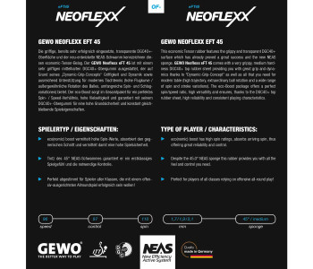 Накладка для ракетки GEWO Neoflexx eFT 45 має гуму середньої жорсткості, яка забезпечує чудове зчеплення та динаміку завдяки технології DGC40+ «Dynamic-Grip-Concept», а також усе, що потрібно для сучасної гри (висока траєкторія, надзвичайне обертання м’яча та широкий діапазон варіацій обертання та удару). Пакет eco-Boost пропонує ідеальне співвідношення обертання/швидкість, високу універсальність і забезпечує високу надійність і незмінні ігрові характеристики завдяки верхньому гумовому шару DGC40+.