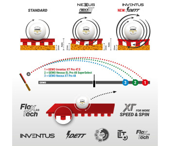 Гнучка губка/гума FLEX-TECH 2.0 (XT), створена спеціально для GEWO, демонструє вражаючу базову швидкість. Гуми серії XT з поверхнею H-Touch DGC40+ 3.0 перетворюють швидкість обертання супротивника у власну енергію та вивільняють її, як катапульта при виході з ракетки. Шипи на гумовому листі розташовані далі один від одного і трохи вужчі ніж на гумках EL. Ці гуми насамперед орієнтовані на швидкість.