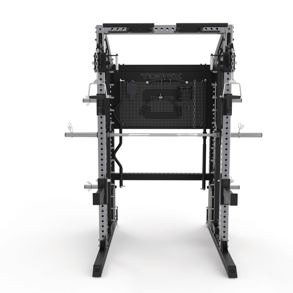 Toorx All-in-One ASX-8000 — це професійна силова станція 3-в-1, яка поєднує в собі машину Сміта, подвійний блочний тренажер і силову раму. Вона створена для інтенсивного використання в комерційних умовах, забезпечуючи максимальну функціональність, надійність та комфорт.