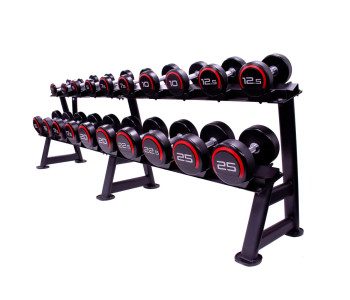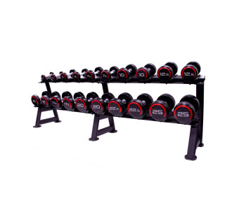 Професійна стійка для гантелей на 10 пар — це міцна й функціональна конструкція, яка забезпечує організоване, безпечне та естетичне зберігання гантелей вагою до 50 кг. Ідеально підходить як для домашніх спортивних куточків, так і для повноцінних комерційних залів. Виготовлена з високоякісної сталевої труби, ця стійка розрахована на довготривале використання під постійними навантаженнями.
