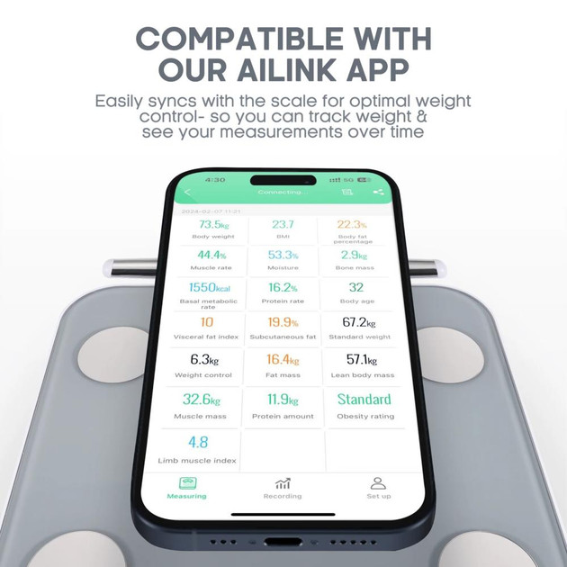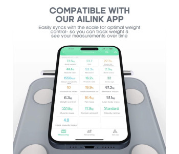 Легко синхронізуйте ваги з додатком AiLink, щоб налаштувати власну програму контролю ваги та відстежувати результати вимірювань у часі. Додаток дозволяє завантажувати або ділитися даними про схуднення, а також додавати друзів, щоб змагатися за успіхи. Ви можете встановлювати нагадування та порівнювати свої дані до і після схуднення, що забезпечує потужну мотивацію.