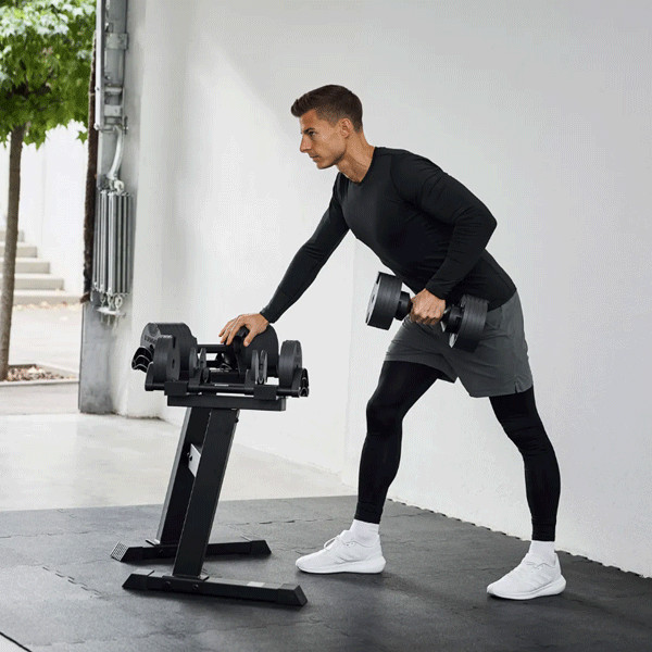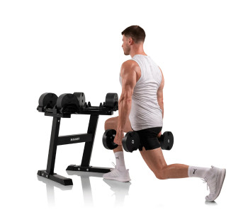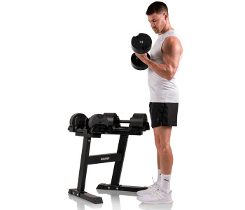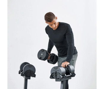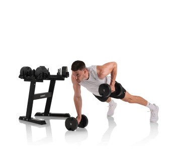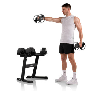Завдяки інноваційній системі SmartLock, ви можете швидко та легко змінити вагу від 2 до 20 кг лише одним рухом. ⚙️ Це робить їх ідеальними для будь-яких вправ — від легких розминок до важких підходів. У комплекті постачається зручний стенд, який забезпечує комфортне зберігання та доступ до гантелей.
