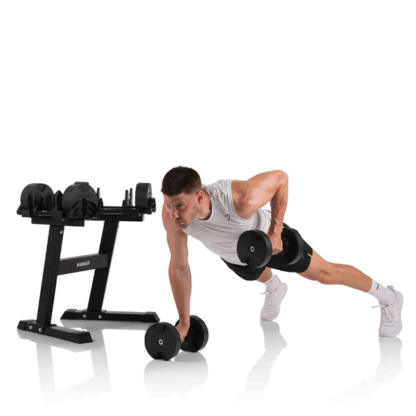Селекторні гантелі Hammer SmartLock — це ідеальне рішення для ефективних силових тренувань в умовах обмеженого простору. 🏡 Один компактний набір замінює цілий ряд із 10 пар гантелей, дозволяючи вам економити місце, час і гроші.