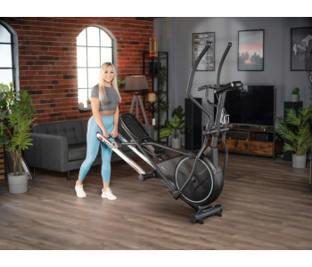 Надійність та мобільність. Міцна конструкція розрахована на користувачів вагою до 150 кг. Регульовані ніжки забезпечують стійкість на будь-якій поверхні, а транспортувальні ролики полегшують переміщення тренажера.