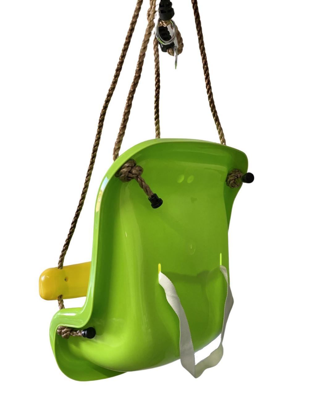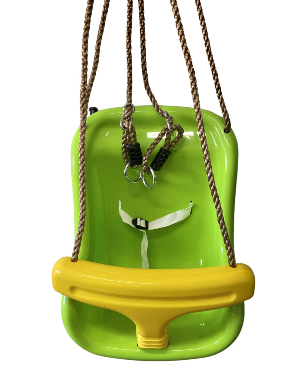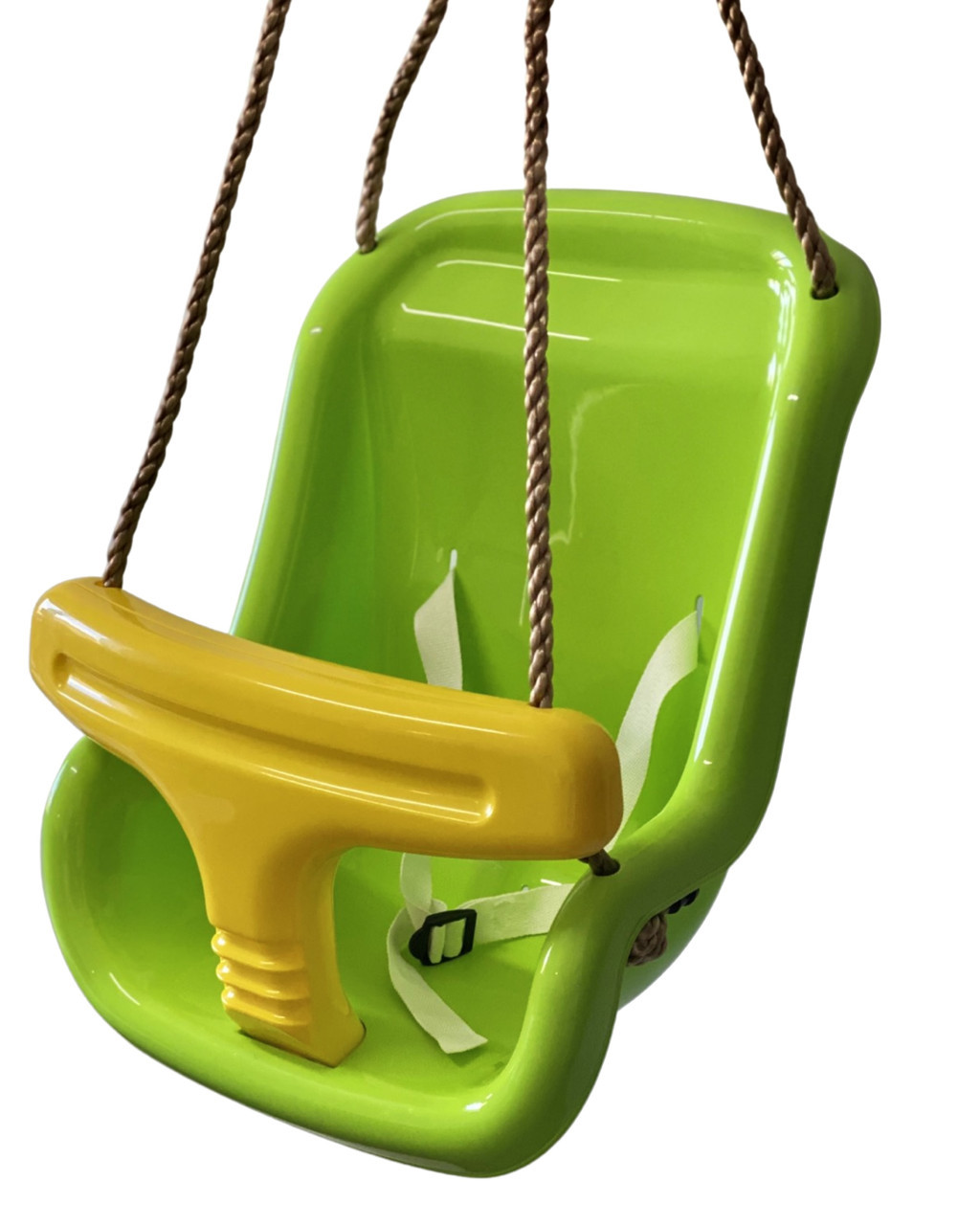 Гойдалки для дітей із захистом WCG Delux мають максимально комфортну конструкцію з ременем безпеки і захисною пряжкою. Висока спинка дитячого сидіння дає додаткову підтримку для голови і шиї маленької дитини. T-подібний захист покращує безпеку. Сидіння виготовлено з пластика високої щільності, не вигоряє і не тьмяніє з часом.
