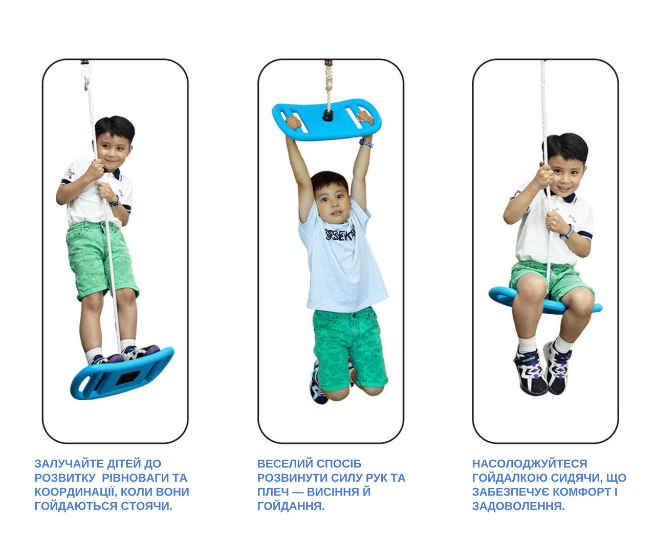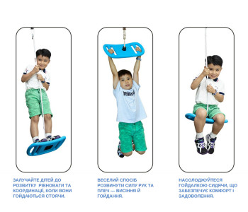 Ця модель ідеально підходить як для кімнати, так і для подвір’я, тераси або дачі. Завдяки універсальному формату «3 в 1», дитина може гойдатися сидячи, стоячи або комбінувати обидва способи, що додає грі нових емоцій і розвиває координацію рухів.