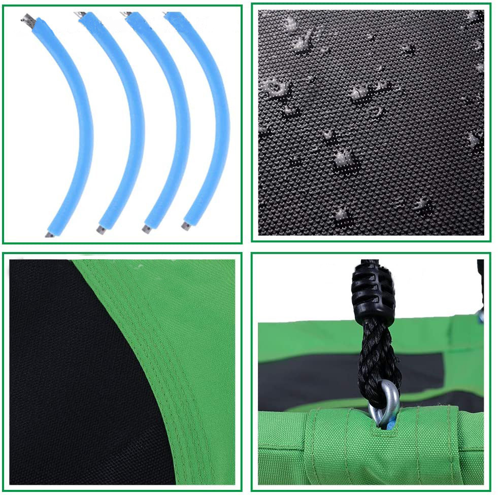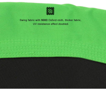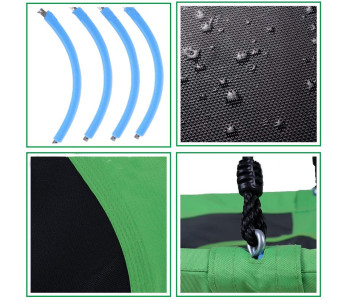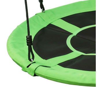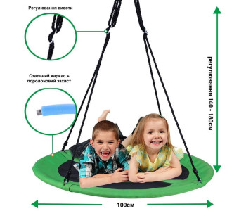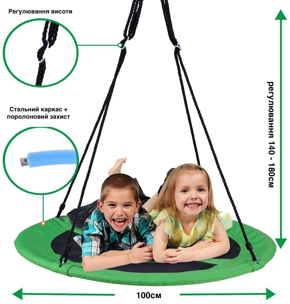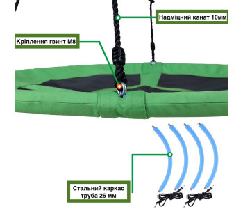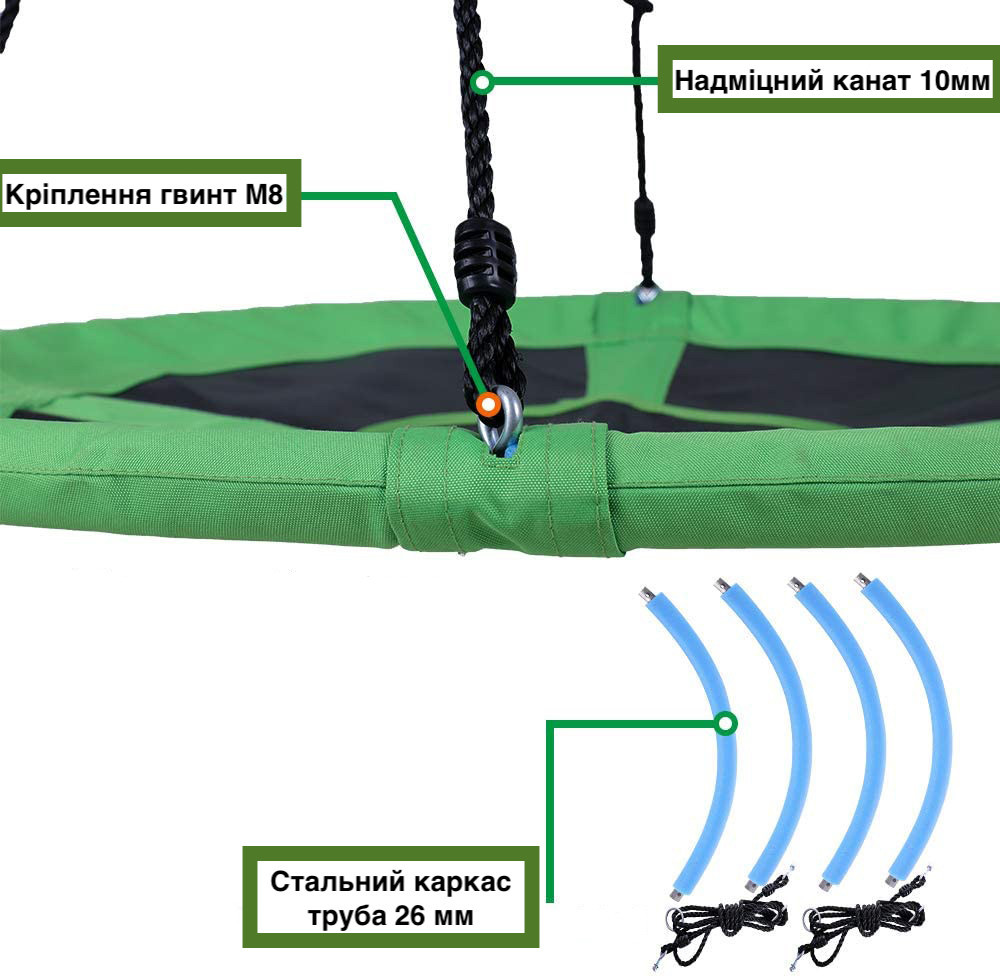Конструкція качелі включає сталевий каркас діаметром 100 см, покритий для безпеки і комфорту спеціальною піною і основу з надміцного матеріалу (600D OXFORD). Канати регулюються по довжині в межах 140-180 см. Вони виготовлені з нейлону діаметром 10 мм, стійкі до зміни погодніх умов, а отже гойдалки можна залишати на дворі в дощ і сніг.