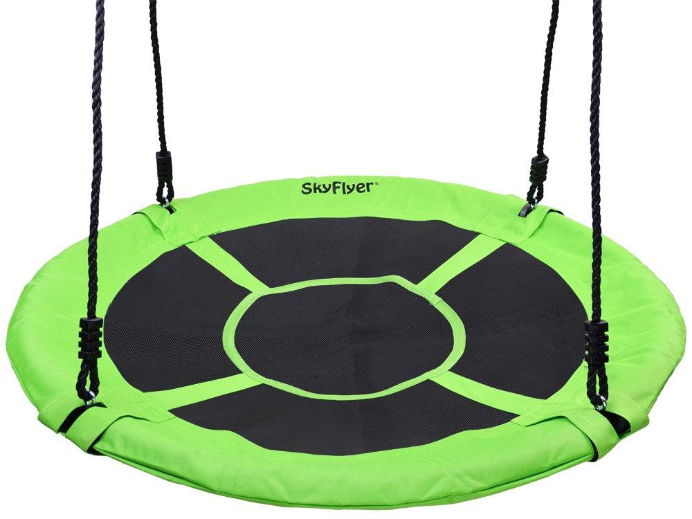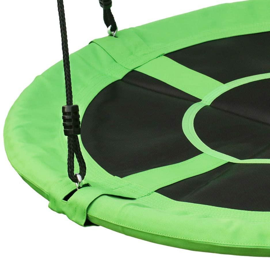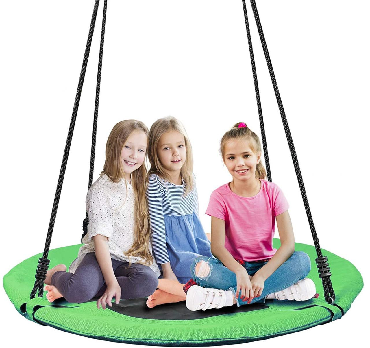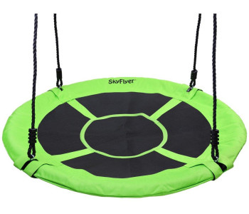 Конструкція качелі включає сталевий каркас діаметром 100 см, покритий для безпеки і комфорту спеціальною піною і основу з надміцного матеріалу (600D OXFORD). Канати регулюються по довжині в межах 140-180 см. Вони виготовлені з нейлону діаметром 10 мм, стійкі до зміни погодніх умов, а отже гойдалки можна залишати на дворі в дощ і сніг.