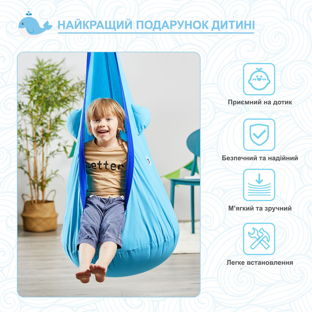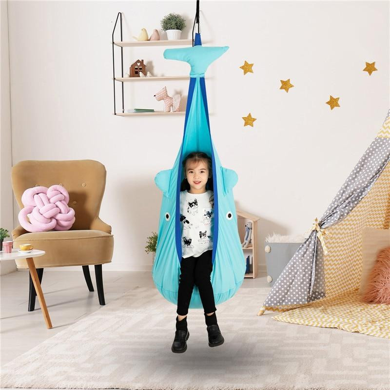 Підвісне стельове крісло у вигляді блакитного кита було придумано для маленьких діток від трирічного віку - справжнє видовище в кожній дитячій кімнаті! Під його гігантським плавником вони можуть мріяти, читати, грати і обійматися, скільки душі завгодно.