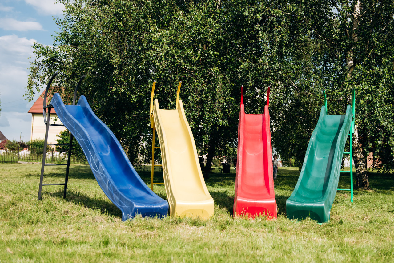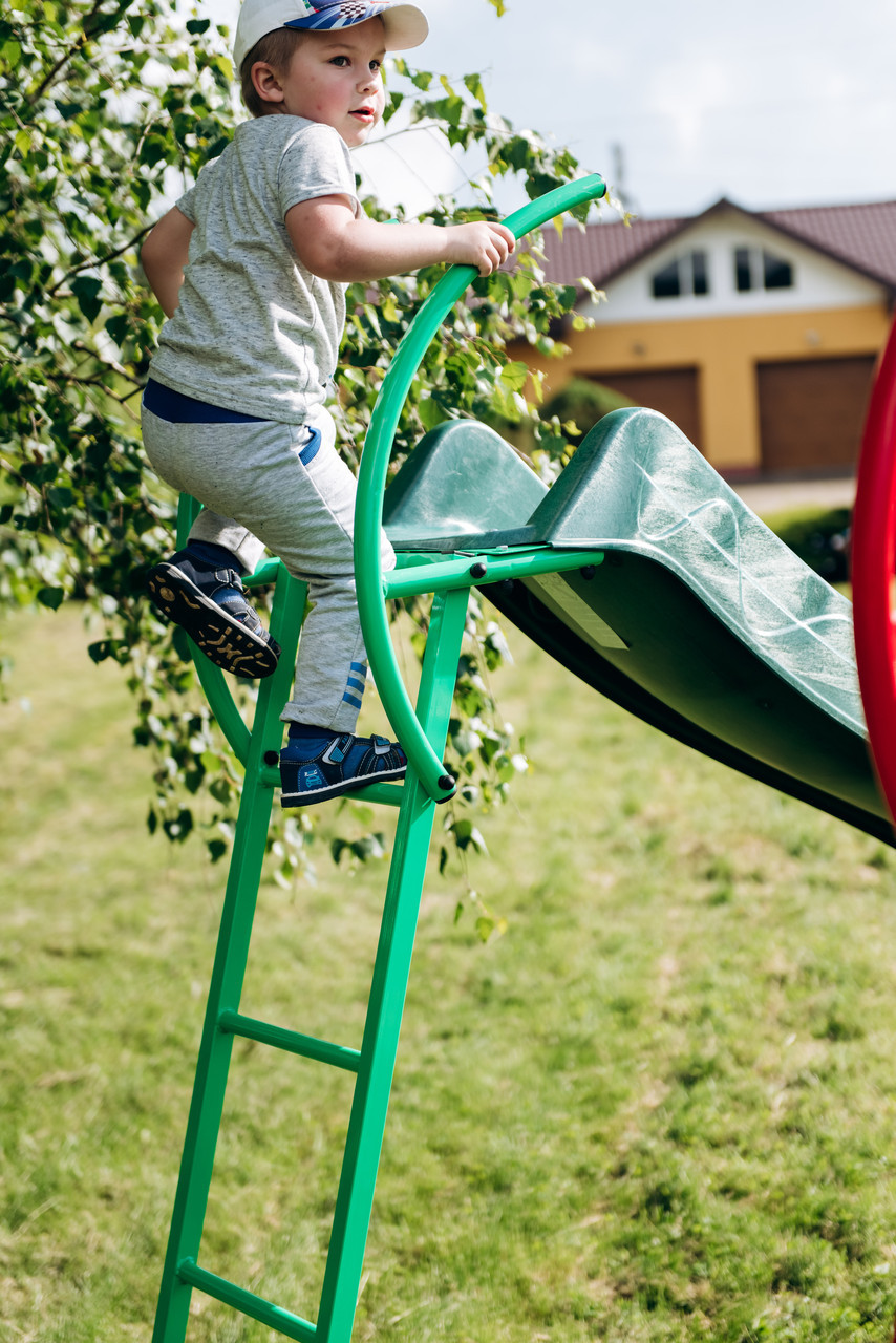Дитяча гірка - спуск із металевими сходами. Прекрасне рішення, якщо мало місця для встановлення великої дерев'яної конструкції.