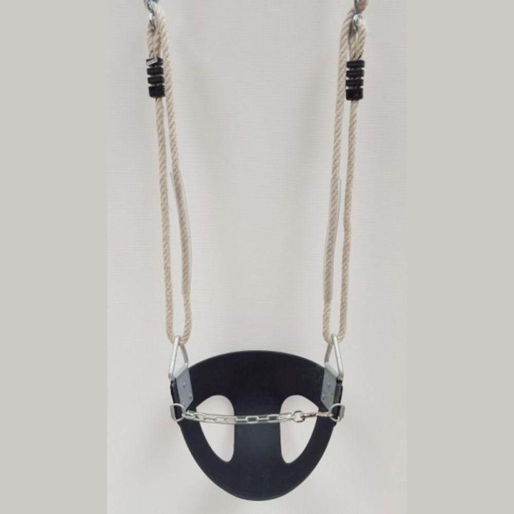 Дитячі гойдалки-кошик зроблені з високоякісного каучуку, завдяки цьому дуже довго зберігають свій вигляд та якість. Як захист від випадання використовується надійний металевий ланцюг, закритий у гумову трубку, тому є комфортним і м'яким для дитини. У комплекті з гойдалками йде армований трос для підвішування, яки розрахований до 100 кг навантаження