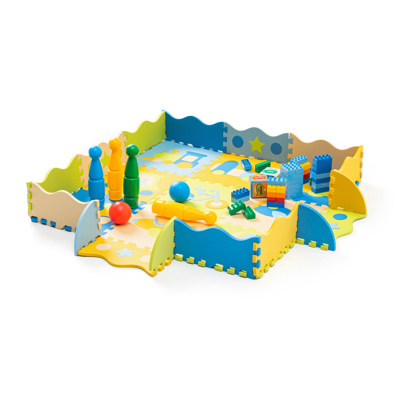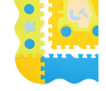 В комплекті 9 квадратних накладок, 16 бортиків. Бортики можна використовувати як огорожу або просто розкласти лежачи та збільшити корисну площу мат килимка.