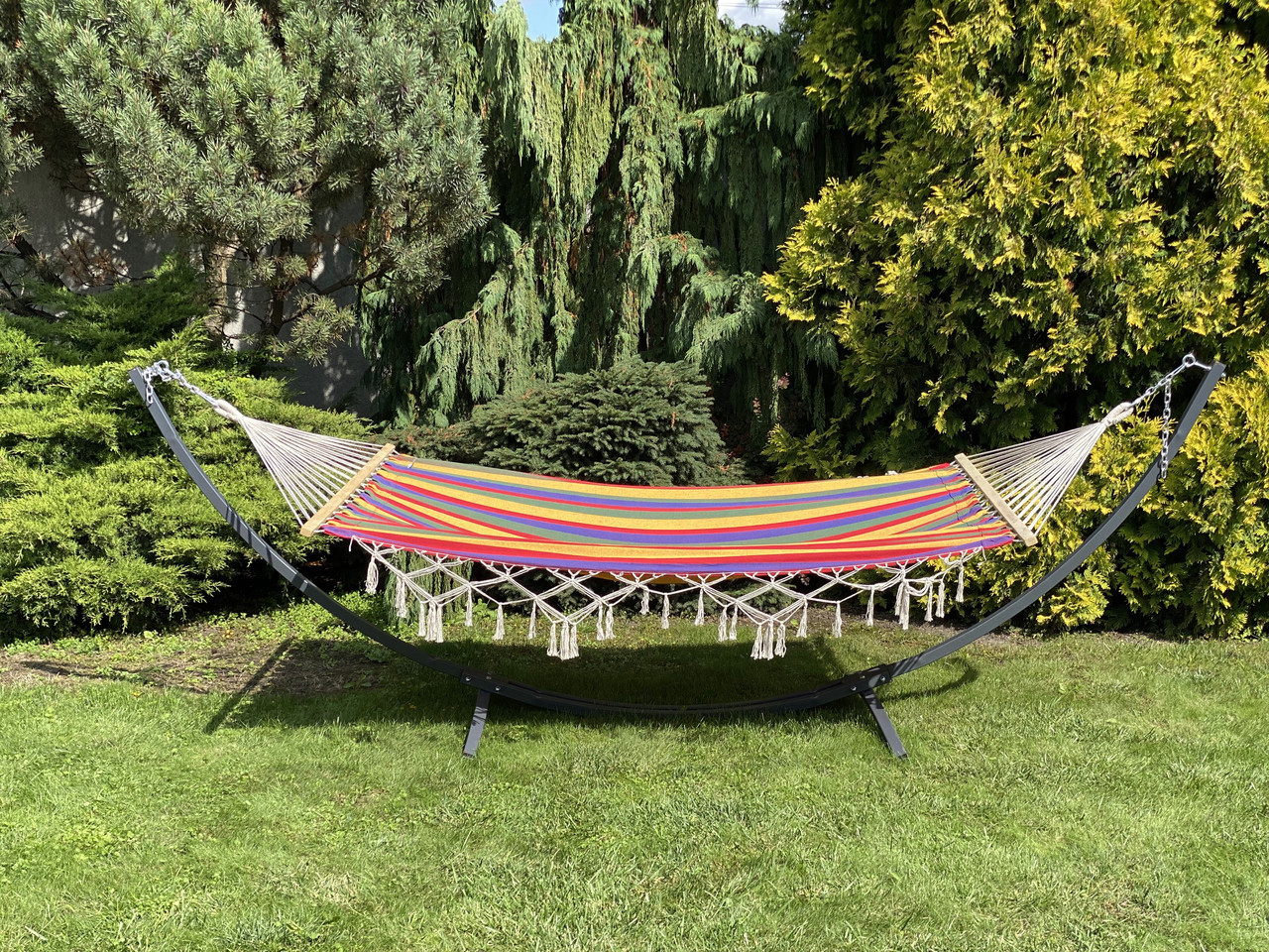 Ми є виробником цих гамаків і рам для них. З цього тільки у нас Ви зможете підібрати металеву раму під гамак, яка доступна в 6 кольорах! Для каркаса використовується добірний профіль товщиною 2 мм, який гарантує безпечне використання.