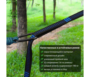 Більшість гамаків які Ви можете зустріти на ринку поставляються без карабінів і замість міцних ременів використовують кріплення на тросу. Це незручно, а також не зовсім безпечно. Ми пропонуємо Вам гамаки з надміцним ременями для безпеки, і з кріпленням на карабінах для простоти в установці! Вам більше не потрібно затягувати вузли переживаючи що гамак впаде.