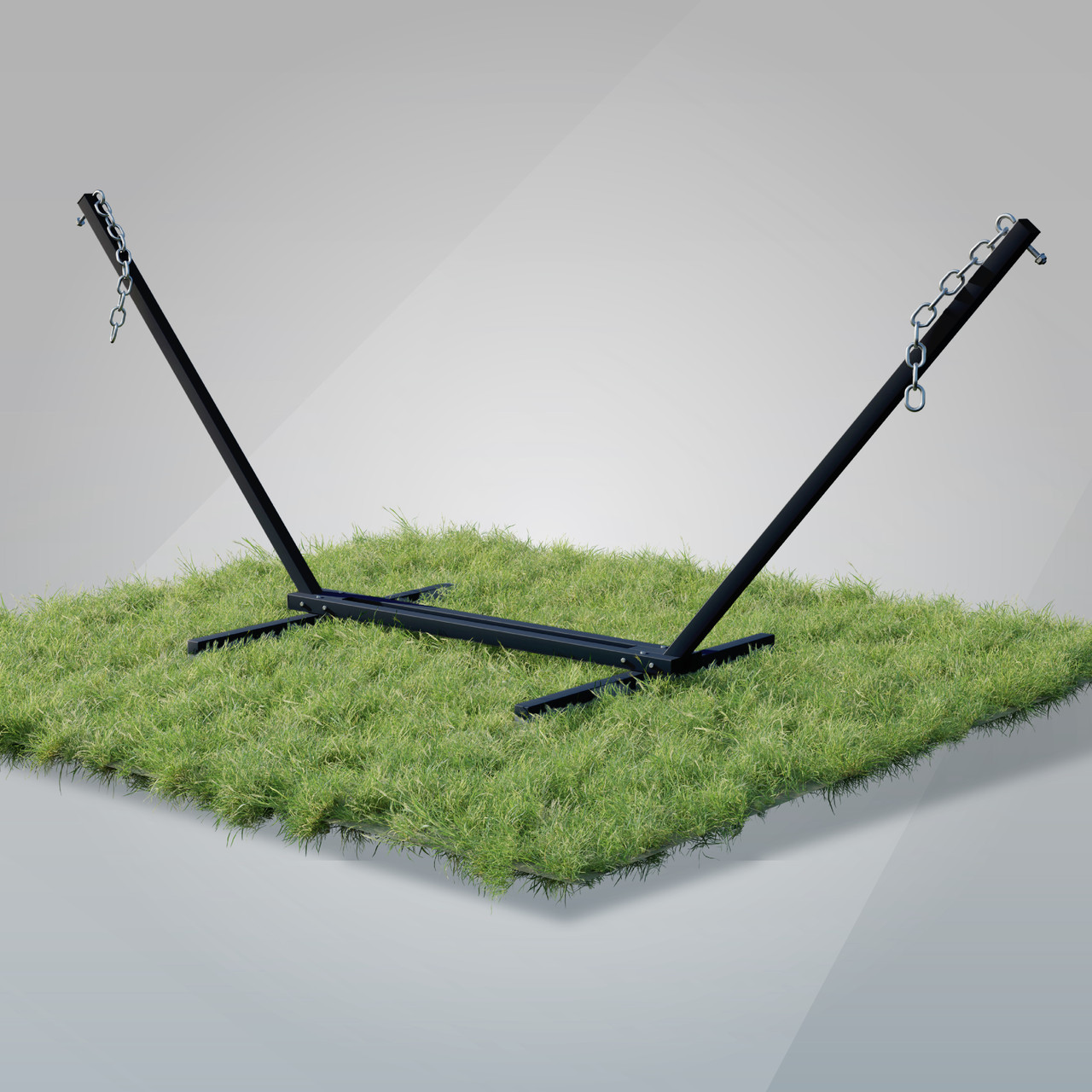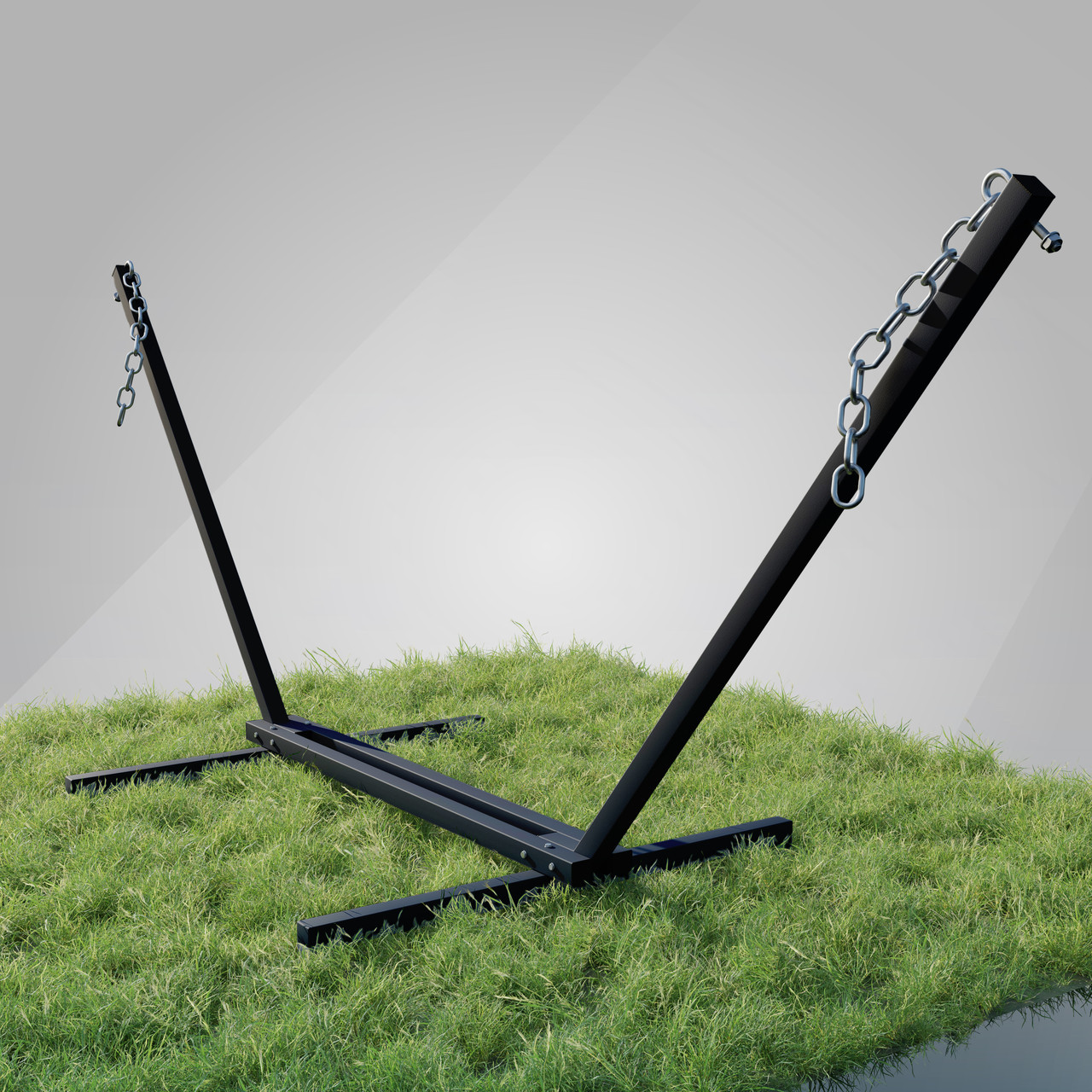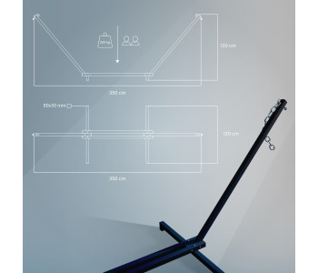 Сталевий каркас для гамака виготовлений з металевого профілю 50х50, що робить його зовнішній вигляд масивнішими, а конструкцію міцною та стійкою. Також стійка для гамака комплектується всіма потрібними елементами для кріплення гамака (гаки м12, карабіни М10 та ланцюги )