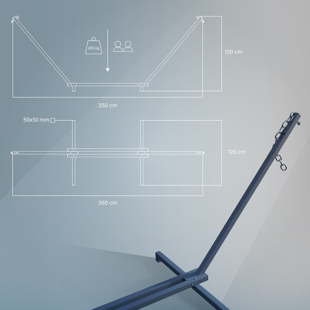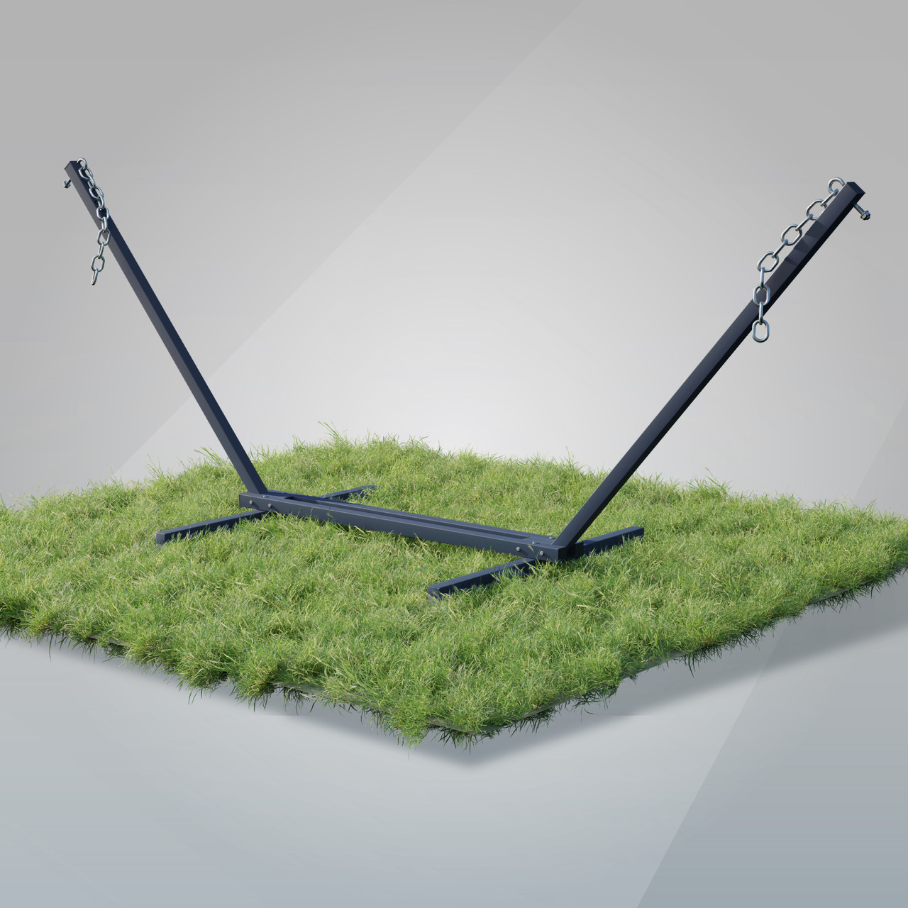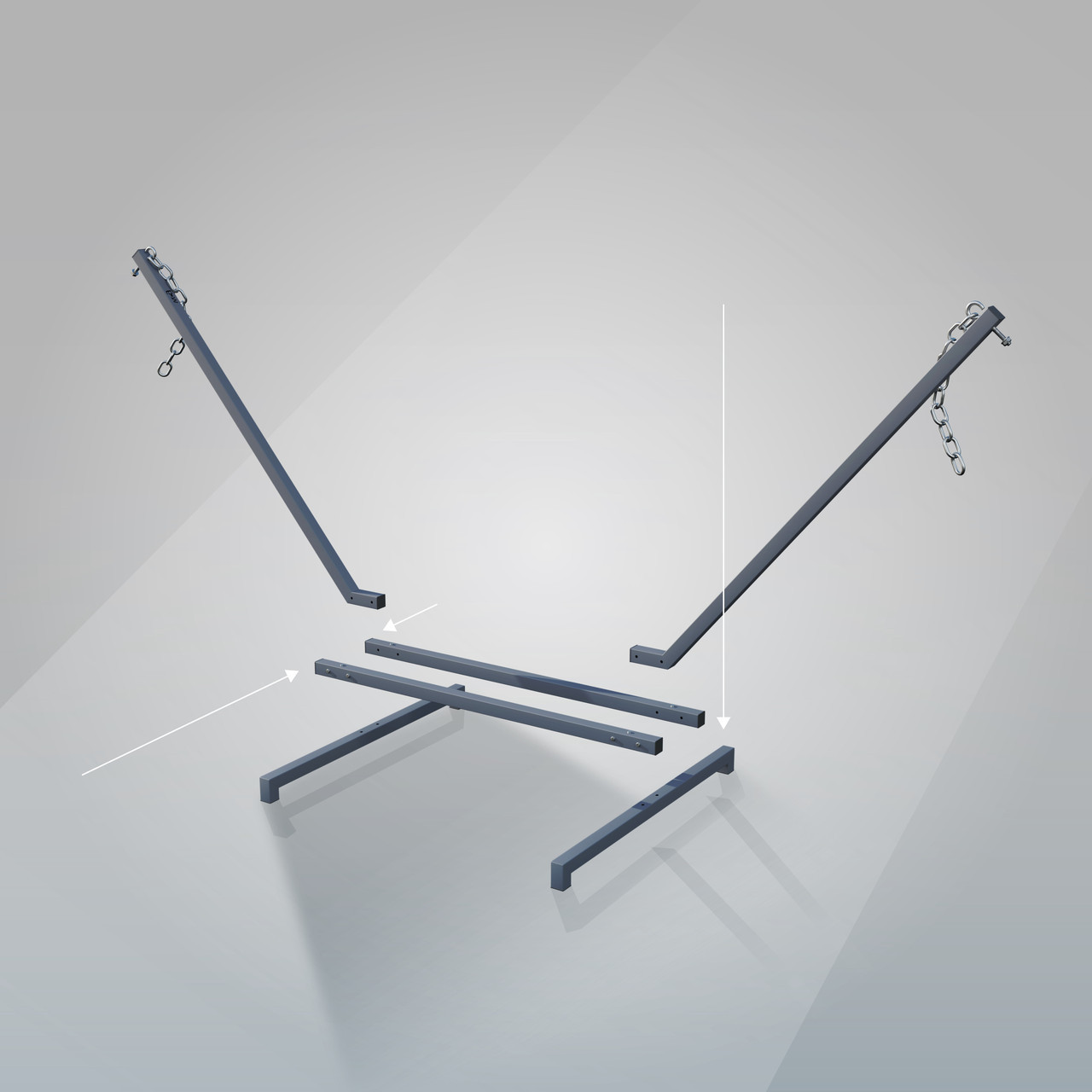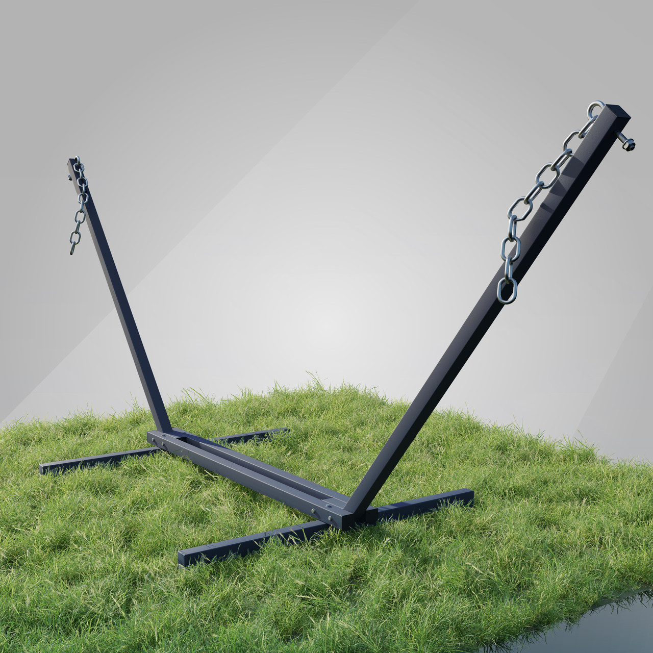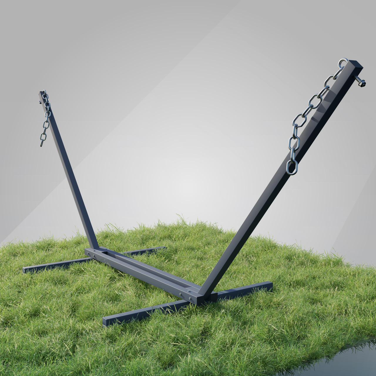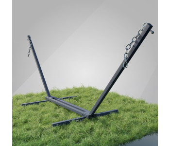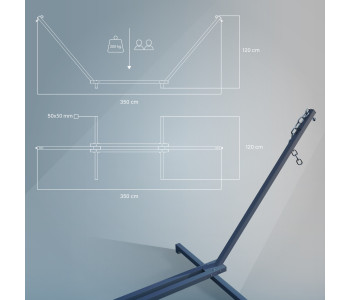 Сталевий каркас для гамака виготовлений з металевого профілю 50х50, що робить його зовнішній вигляд масивнішими, а конструкцію міцною та стійкою. Також стійка для гамака комплектується всіма потрібними елементами для кріплення гамака (гаки м12, карабіни М10 та ланцюги )