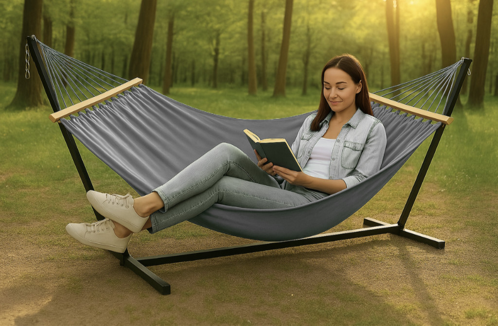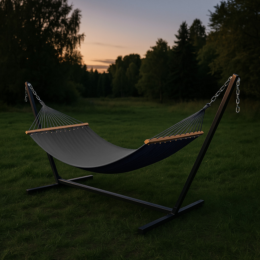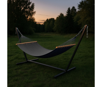 Каркас стійки підходить для всіх типів гамаків: одномісного, двомісного, сімейного. У комплекті зі стійкою надається весь необхідний комплект кріплень для збірки стійки і установки гамака.