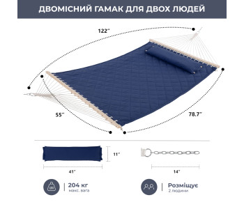 Просторий і м'який, цей двомісний гамак — як обійми улюбленого пледа. Зносостійке двошарове полотно, м’який наповнювач і стильне стьобання роблять його не просто гамаком, а справжнім куточком відпочинку. Не боїться сонця, дощу і навіть літа безперервно!