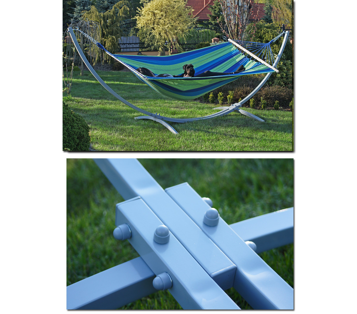 Сталевий каркас для гамака виготовлений з металевого профілю 40х40, що робить його зовнішній вигляд масивнішими, а конструкцію міцною та стійкою. Також стійка для гамака комплектується всіма потрібними елементами для кріплення гамака (гаки, карабіни та ланцюги )