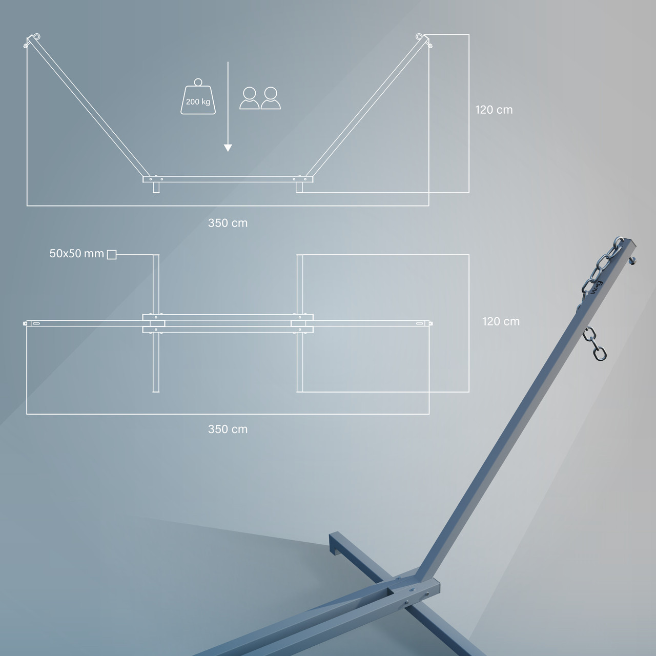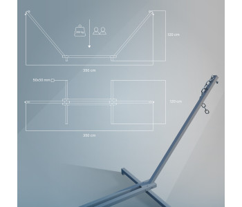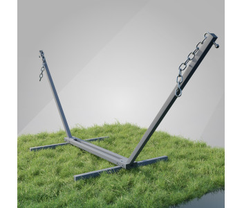 Сталевий каркас для гамака виготовлений з металевого профілю 50х50, що робить його зовнішній вигляд масивнішими, а конструкцію міцною та стійкою. Також стійка для гамака комплектується всіма потрібними елементами для кріплення гамака (гаки м12, карабіни М10 та ланцюги )