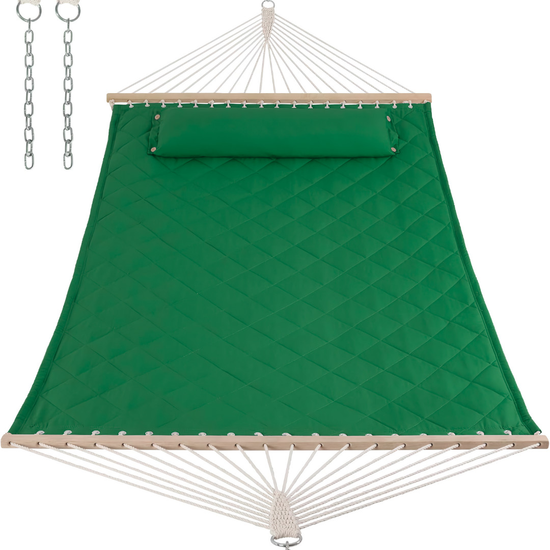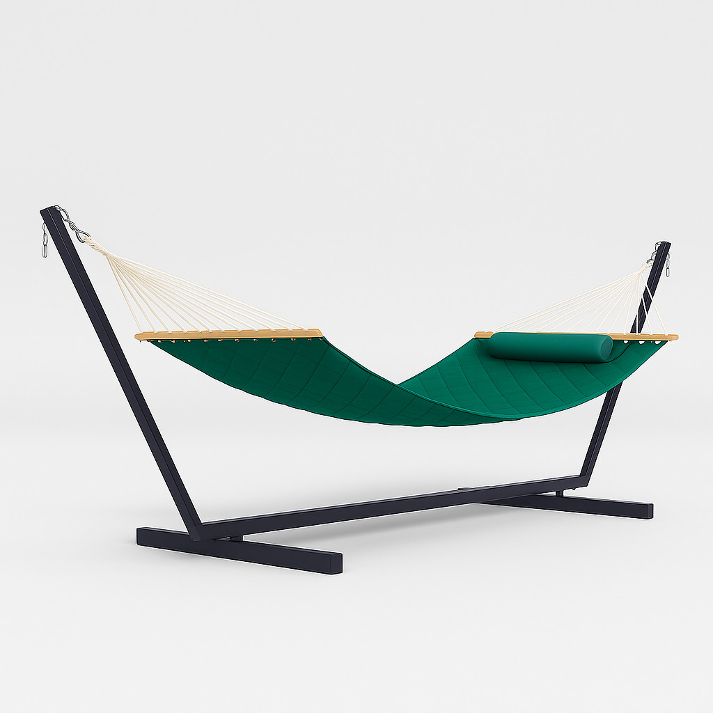 Просторий і м'який, цей двомісний гамак — як обійми улюбленого пледа. Зносостійке двошарове полотно, м’який наповнювач і стильне стьобання роблять його не просто гамаком, а справжнім куточком відпочинку. Не боїться сонця, дощу і навіть літа безперервно!