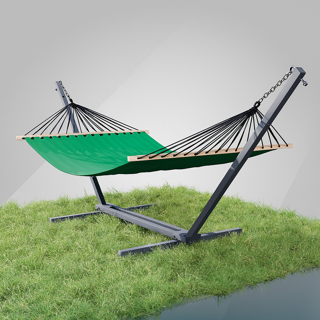 Сталевий каркас для гамака виготовлений з металевого профілю 50х50, що робить його зовнішній вигляд масивнішими, а конструкцію міцною та стійкою. Також стійка для гамака комплектується всіма потрібними елементами для кріплення гамака (гаки м12, карабіни М10 та ланцюги )