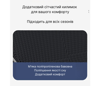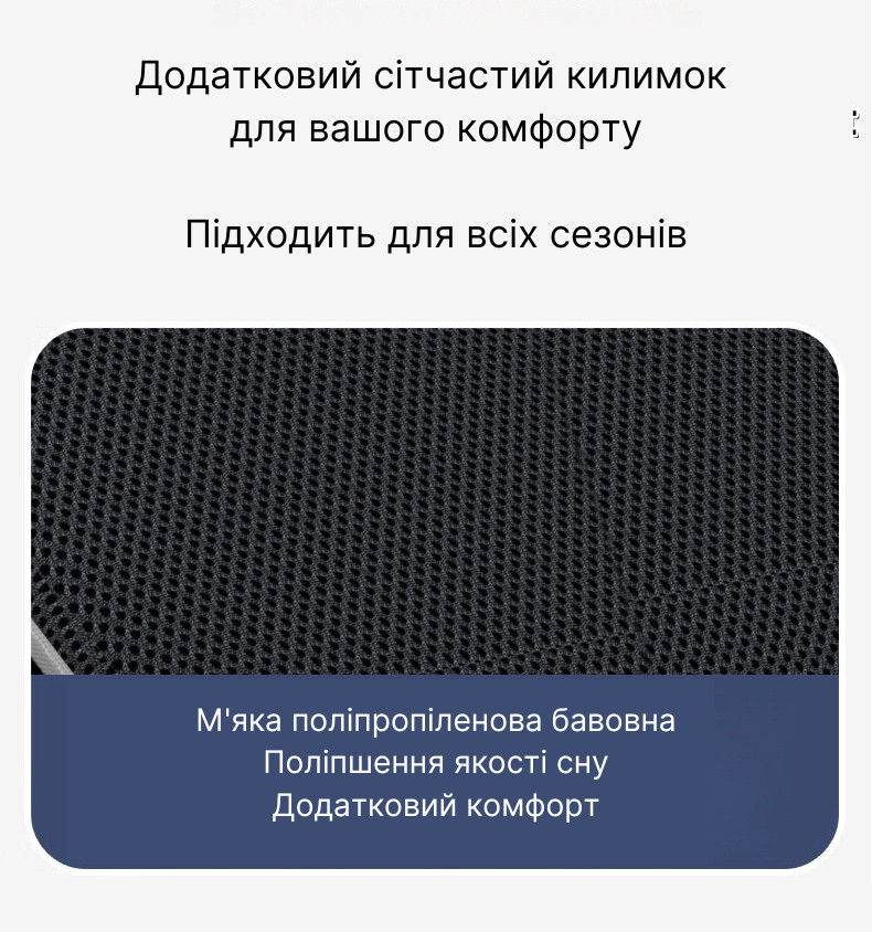 - Матрац: сітчаста тканина air mesh + наповнювач Поліефірне волокно 2,5 см