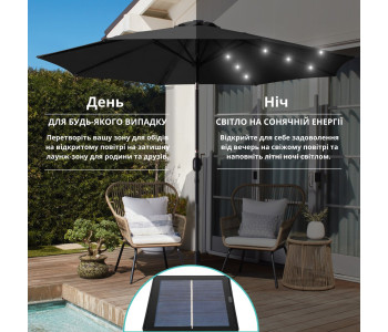 Насолоджуйтеся комфортом та затишком на відкритому повітрі завдяки стильній та багатофункціональній садовій парасолі з LED-підсвіткою. Ця модель ідеально підійде для вашого саду, тераси, басейну, кафе чи ресторану, створюючи комфортну зону відпочинку вдень і атмосферне освітлення ввечері.