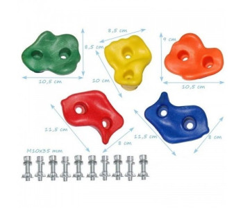 Набір із п'яти каменів для сходження в різних кольорах. Камені зроблені з міцного пластику. Вони широко використовуються в різних типах конструкцій або наборів ігрового обладнання, також використовуються окремо.