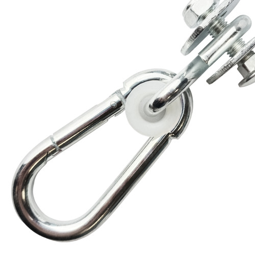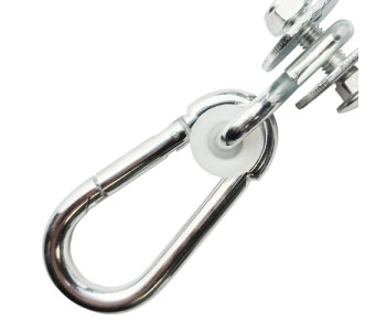 Підвіс для гойдалок виготовлений з високоякісної сталі товщиною 3 мм, та комплектується карабіном з нейлоновою втулкою. Нейлонова втулка є набагато міцнішою ніж пластикова, вона забезпечує менше тертя та знижує шум.