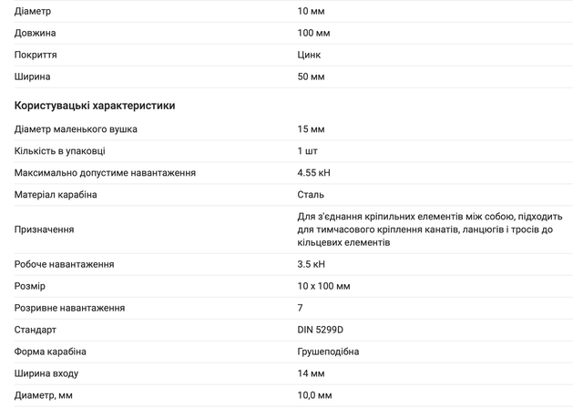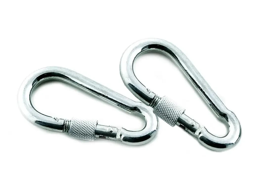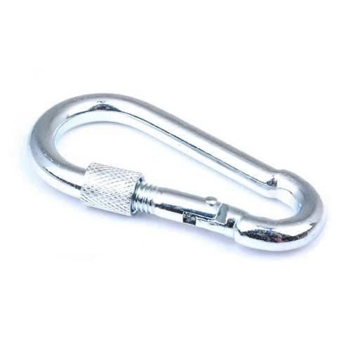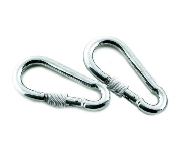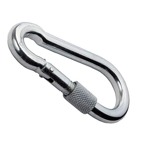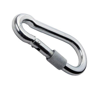 Карабін з замком - простий у використанні і надійний елемент для роз'ємного кріплення тросів, канатів, ланцюгів. Кінці гаків з'єднані засувкою з фіксатором (замком), який є особливістю карабіна. Пружинний фіксатор надійно запобігає розмикання карабіна, а низьковуглецева сталь робить карабін високоміцним елементом. Застосовується для всіх типів тросів і ланцюгів і рекомендується для швидкого і надійного кріплення страхувальних ланцюгів, тросів, між собою або до чого-небудь.