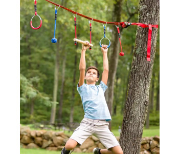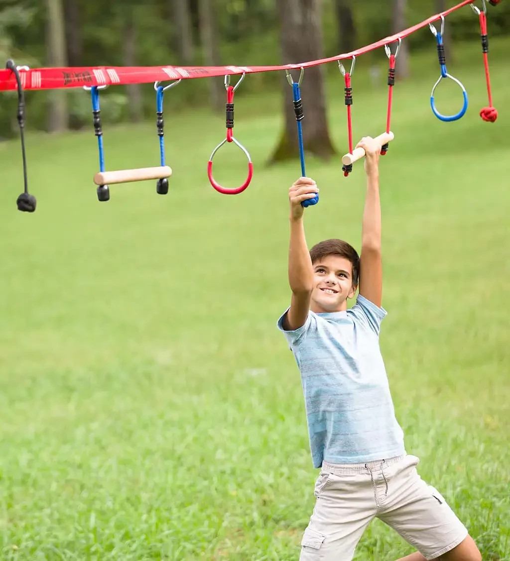 Цей комплект перешкод на задньому дворі, оснащений трапецією, кільцями, мотузками, що дозволяє дітям тренуватися все старанніше і старанніше, переміщаючи перешкоди далі один від одного в міру поліпшення їх навичок.
