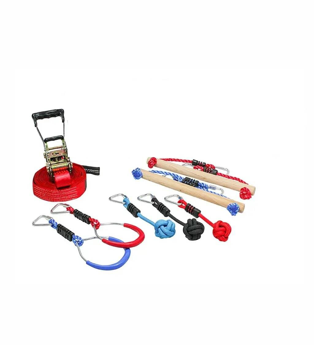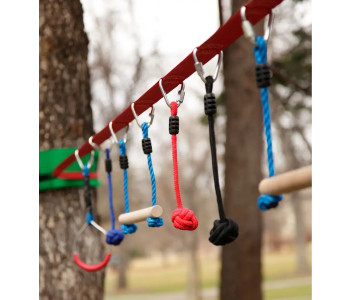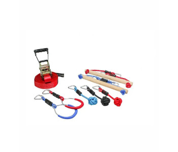 Комплектація: 2 кільця, 2 гойдалки 3 кулака ніндзя можуть бути індивідуально прикріплені до лямки. 11 м в довжину, 5 см шириною з пришитими петлями і цільним металевим храповиком з пластиковою ручкою, Ninja Line також може використовуватися в якості провисання.