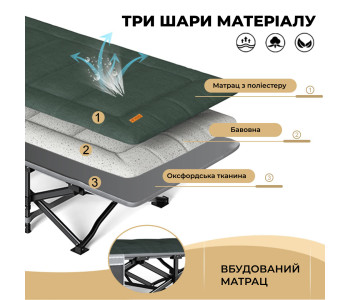 Покриття: 800D Oxford, Щільність 400 г/м2. – високоміцний та довговічний матеріал, який значно перевершує за якістю 600D Oxford Щільність 215 г/м2, що використовують аналогічних похідних ліжках та у дешевих варіантах розкладачок.
