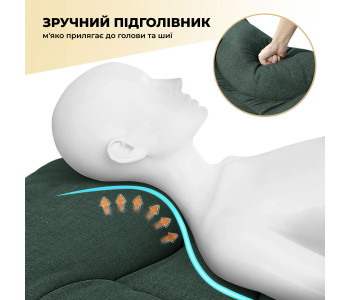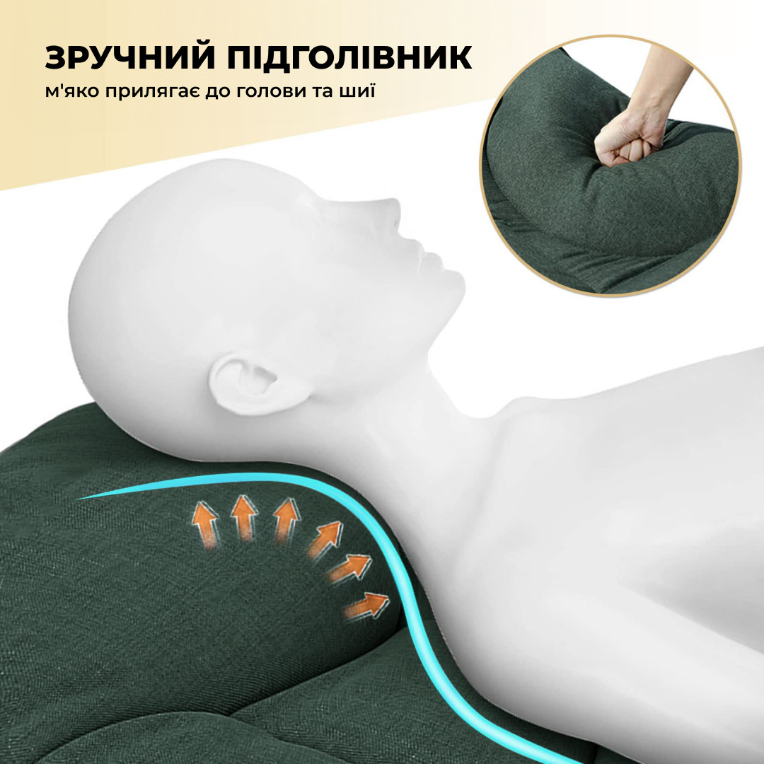 - Регульована спинка: Спинка має кілька положень, що дозволяє вибрати найзручніший кут нахилу для відпочинку, читання або сну.