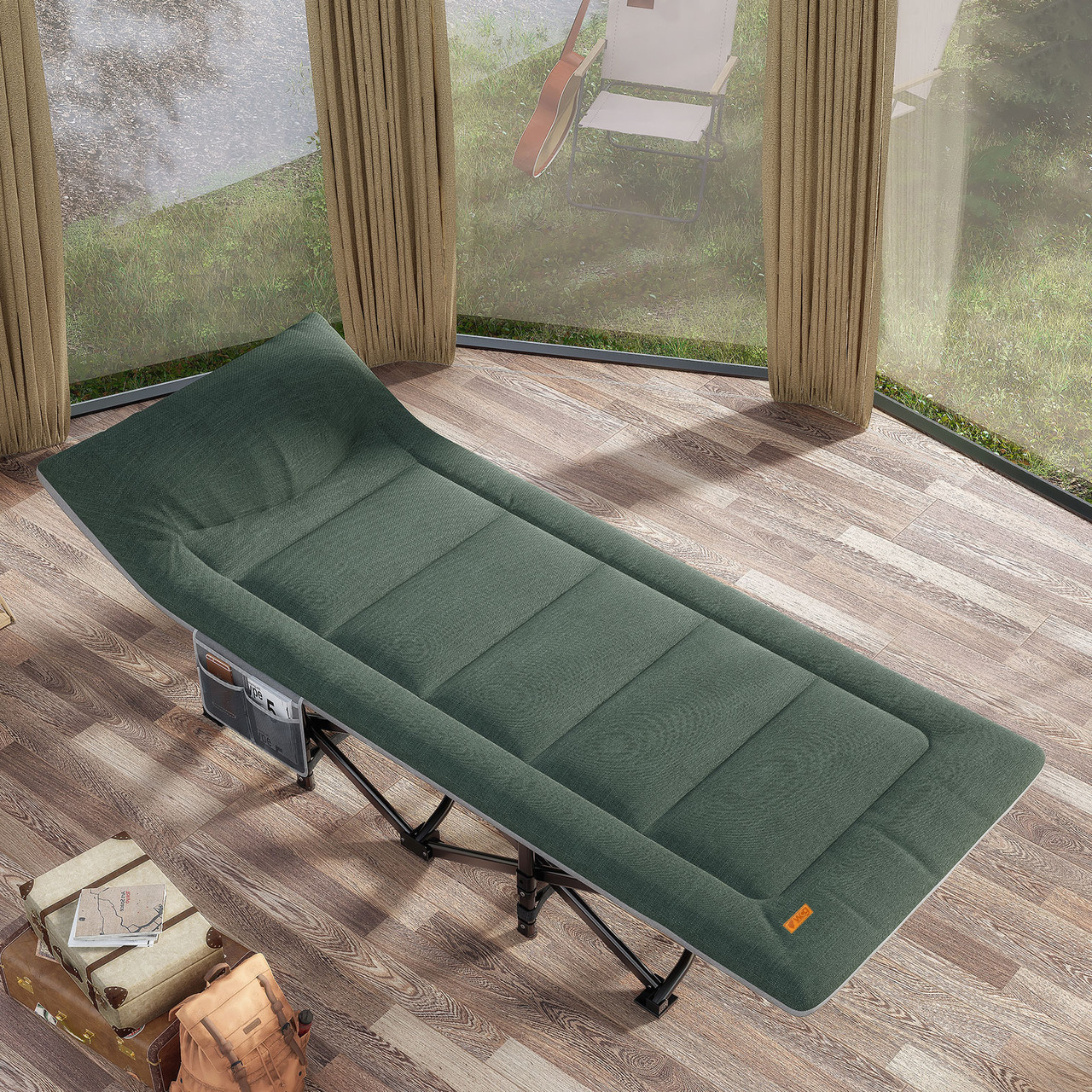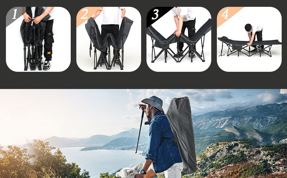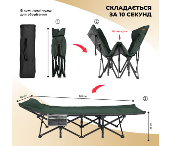 Портативна розкладачка доступна для сидіння, лежання та сну поставляється разом з чохлом в комплекті для зручного зберігання та транспортування. Використовується як розкладачка для дорослих, дітей, офісна розкладачка або гостьове ліжко в кімнаті, розкладний шезлонг для відпочинку на задньому дворі або на пляжі.