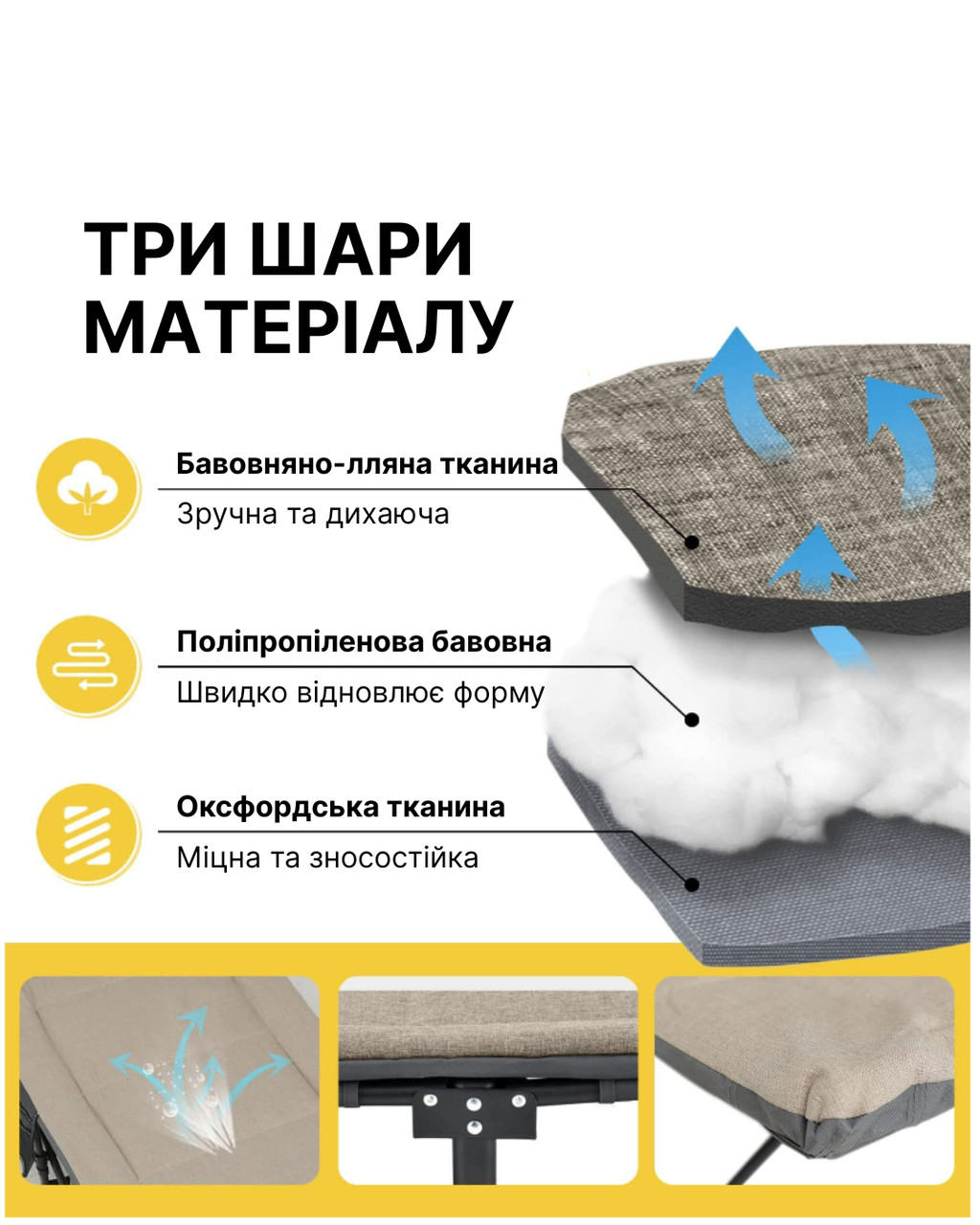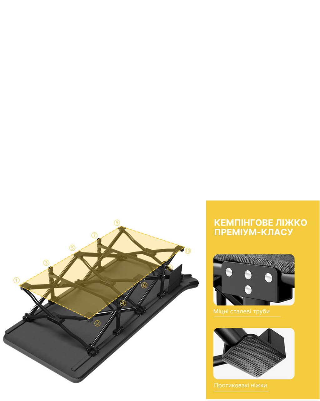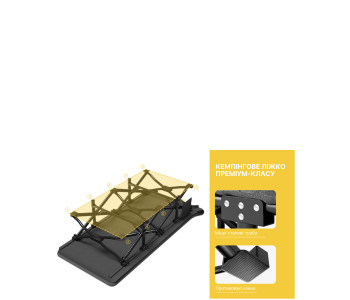 Покриття: 800D Oxford, Щільність 400 г/м2. – високоміцний та довговічний матеріал, який значно перевершує за якістю 600D Oxford Щільність 215 г/м2, що використовують аналогічних похідних ліжках та у дешевих варіантах розкладачок.