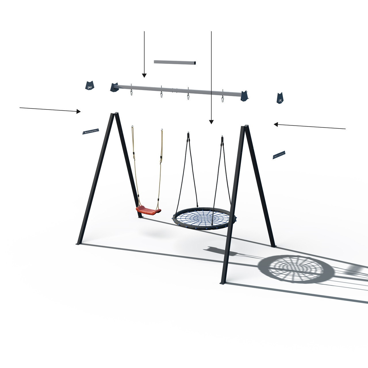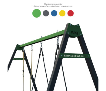 Особливістю нашого каркаса для гойдалок є можливість обрати один із п’яти кольорів верхньої перекладини та бокових пластин — червоний, салатовий, графітовий, синій або жовтий — щоб ідеально поєднати його з вашою гойдалкою, тоді як ніжки каркаса залишаються в стильному матовому чорному кольорі.