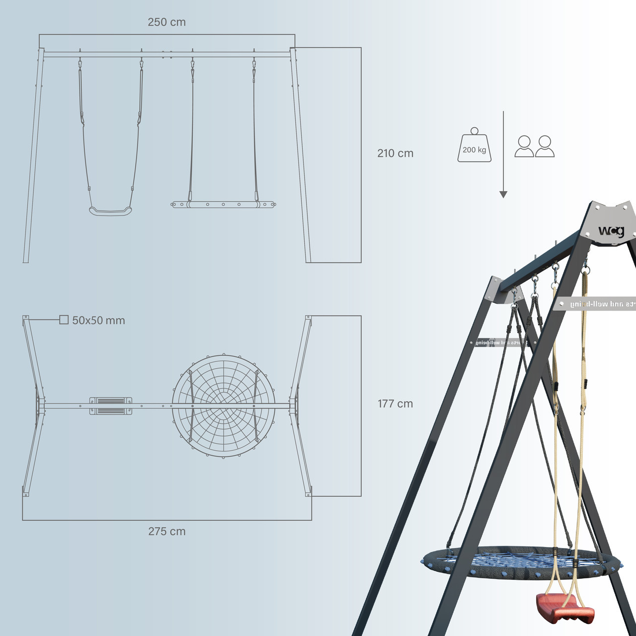 WCG 2 Play Frame це універсальний каркас який ідеально підходить як каркас для дитячої гойдалки або стійка для підвісної гойдалки, забезпечуючи комфорт і безпеку для всієї родини. Він слугує основою, що гарантує безпечне використання гойдалки та забезпечує стійкість під час активних ігор. Такий каркас дає змогу встановити гойдалку у дворі, саду чи на терасі, створюючи безпечний простір для веселощів і розвитку дітей.