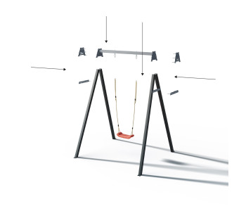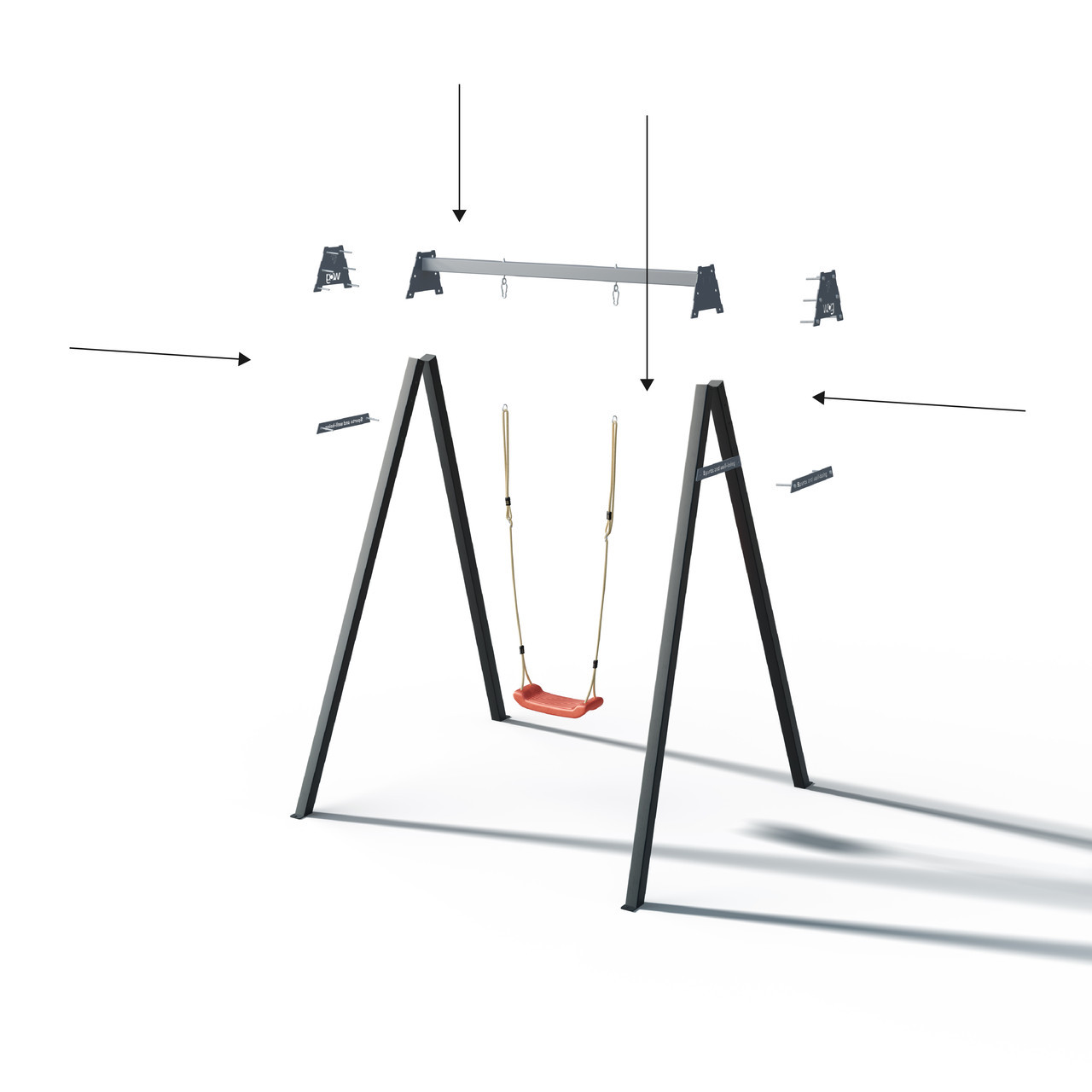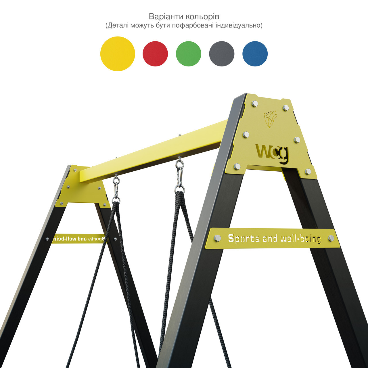 Особливістю нашого каркаса для гойдалок є можливість обрати один із п’яти кольорів верхньої перекладини та бокових пластин — червоний, салатовий, графітовий, синій або жовтий — щоб ідеально поєднати його з вашою гойдалкою, тоді як ніжки каркаса залишаються в стильному матовому чорному кольорі.
