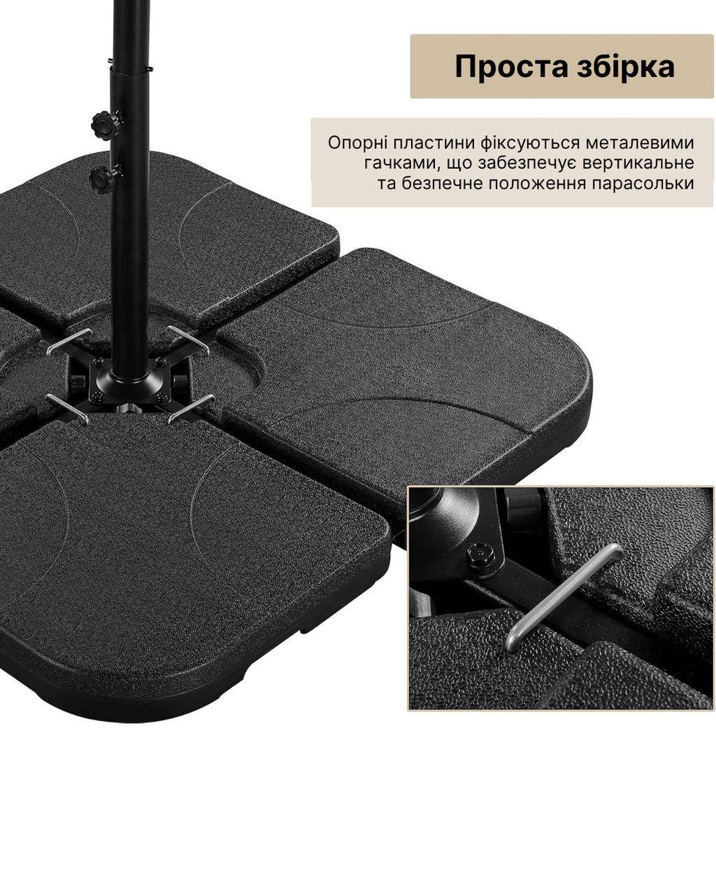 Універсальність: підходить до більшості моделей садових парасоль, зокрема парасоль з боковою (дотичною) стійкою.