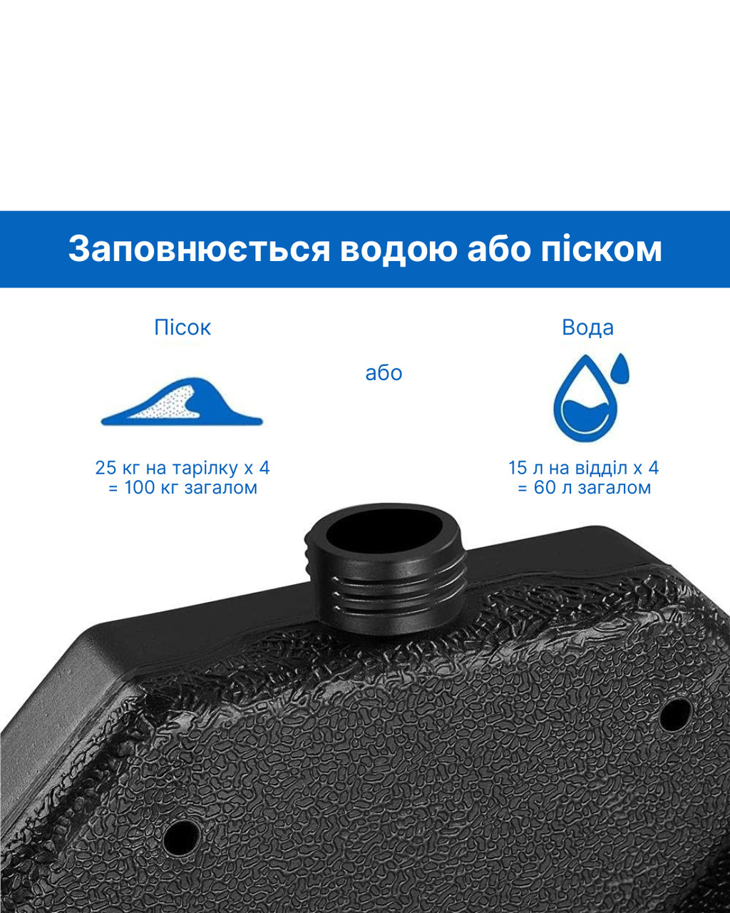 Стабільність: при заповненні піском або водою забезпечує надійне утримання навіть великих зонтиків.
