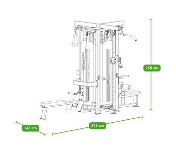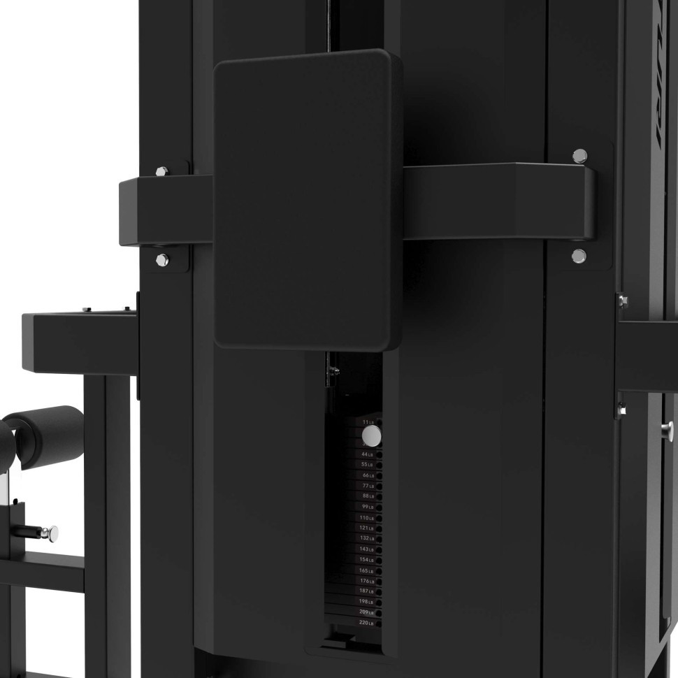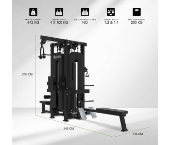 Оснащена чотирма стеками по 100 кг кожен, що дозволяє одночасно тренуватися кільком користувачам та забезпечує плавний розподіл ваги.